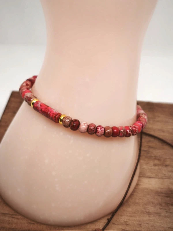 Bracelet en perles de 4mm sur 2mm de jaspe sédimentaire rouge . Taille ajustable avec poignet minimum de 15cm.
