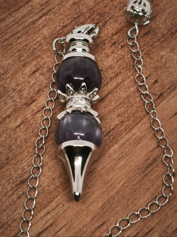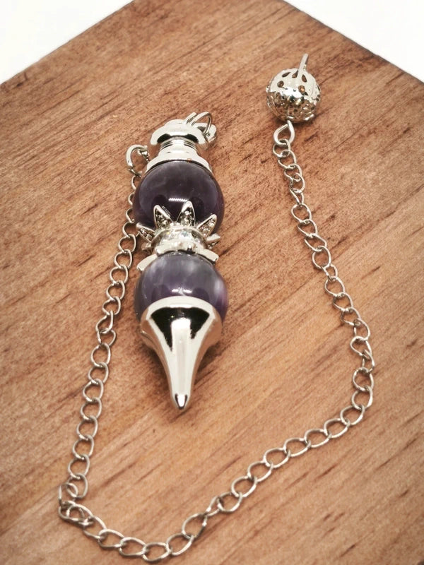 Pendule divinatoire en pierre d'améthyste et acier inoxydable. Longueur 23cm.