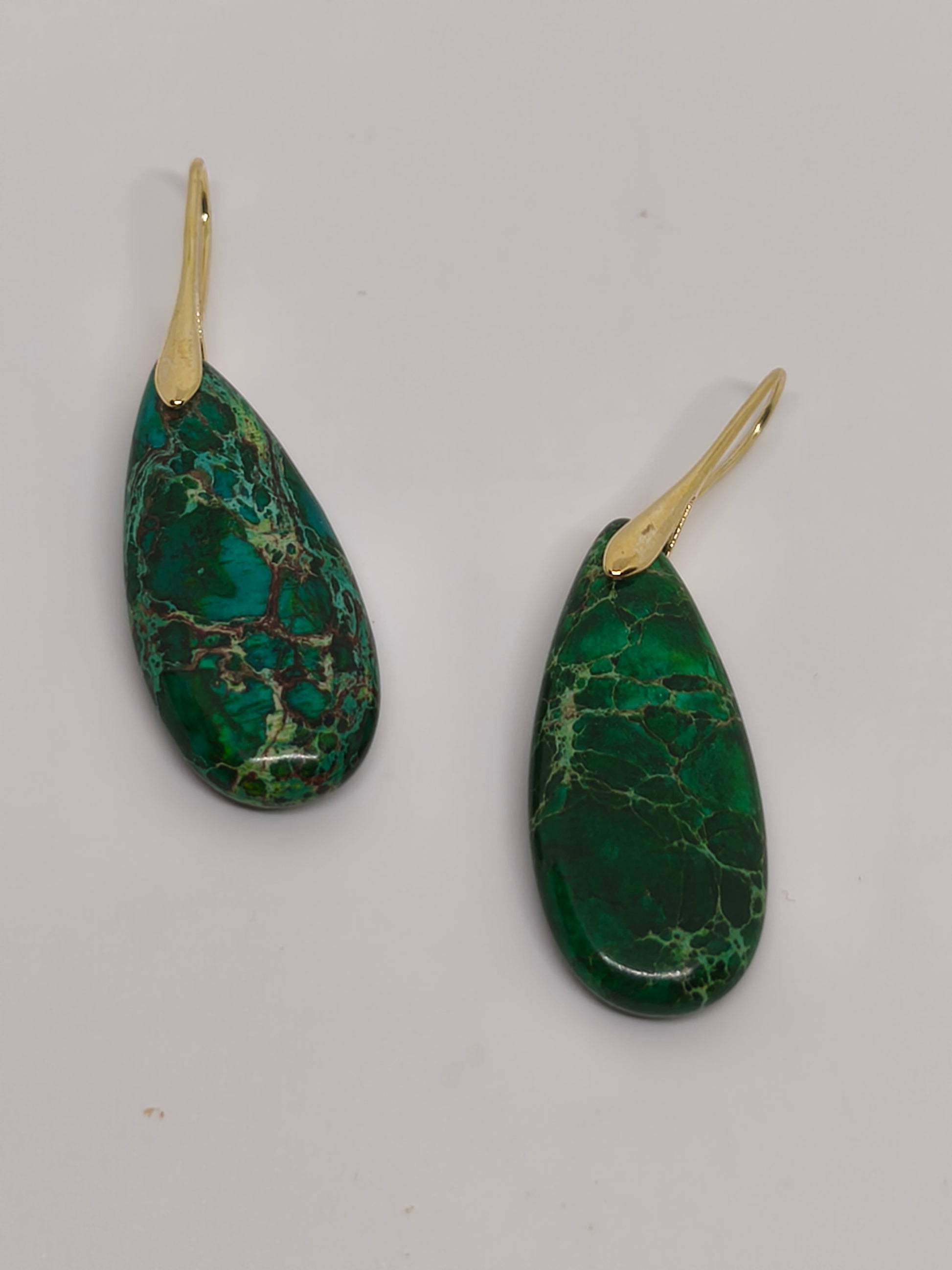 Boucles d'oreilles en jaspe impérial vert. Longueur 5cm, largeur 1,5cm. Poids 9g les deux.