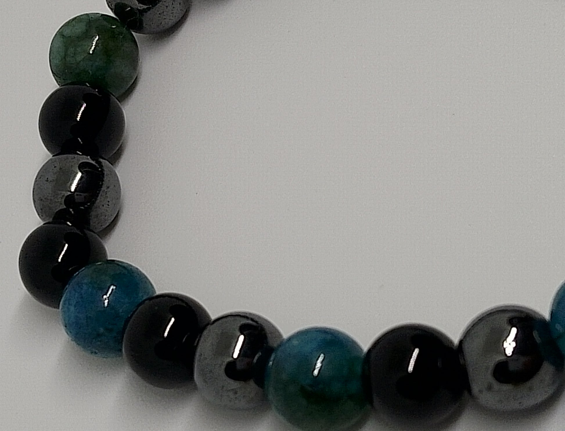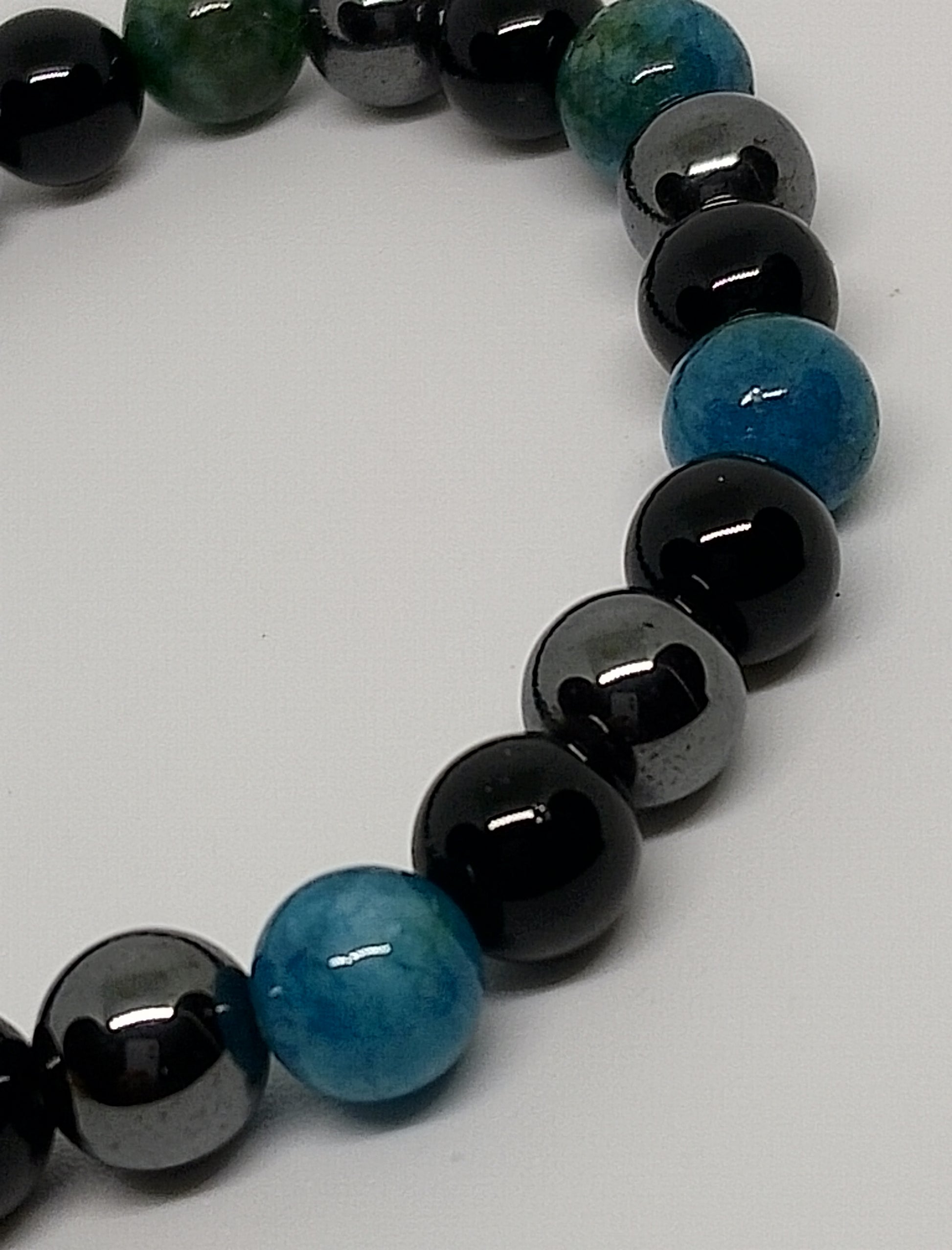 Bracelet en perles de 8mm d'apatite, d'hématite et d'onyx noire. Poignet 15-16cm, poids 20g