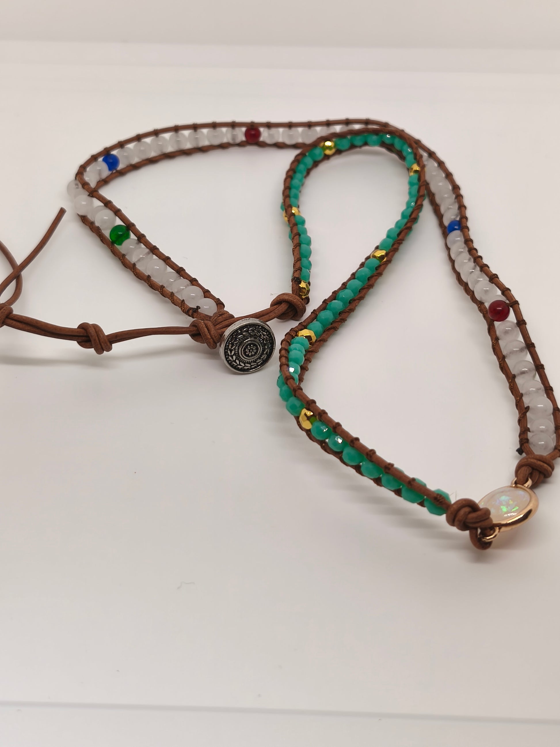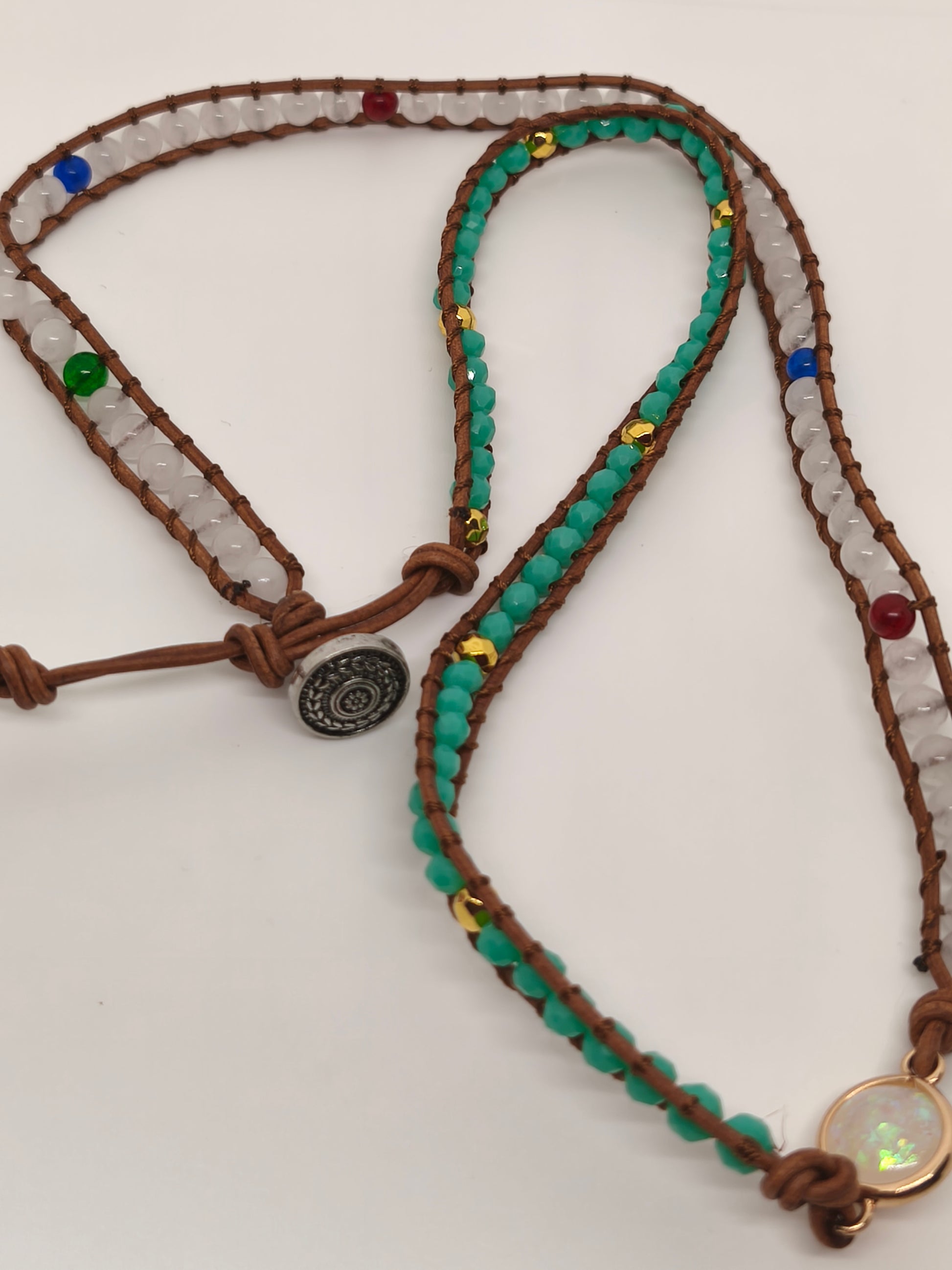 Bracelet enveloppant neuf en perles de 4mm d'aventurine et quartz blanc. Peut se porter en collier également. Longueur totale 63cm, largeur 0,6cm