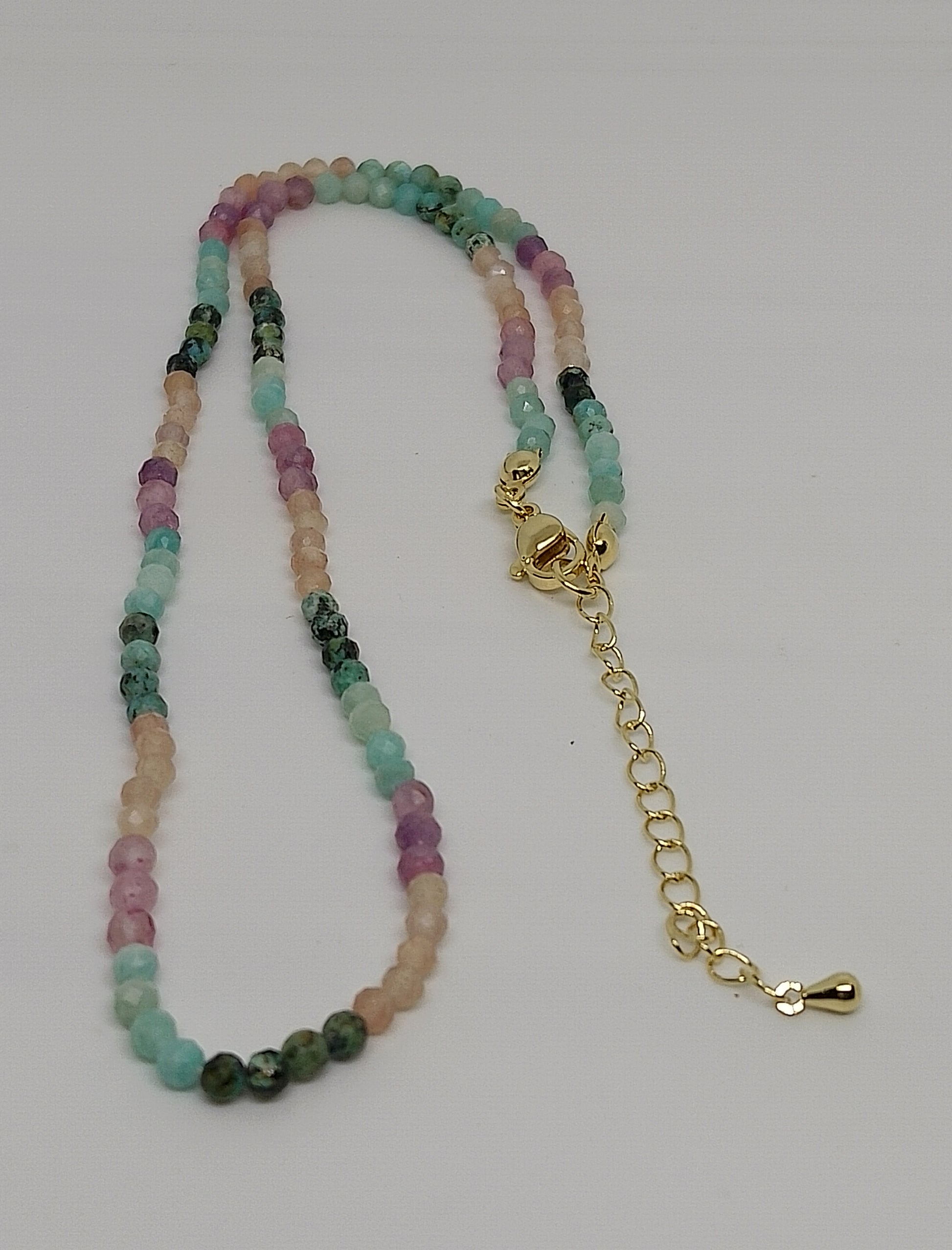 Collier en perles facettes d'améthyste, aventurine, quartz rose, turquoise africaine 2mm