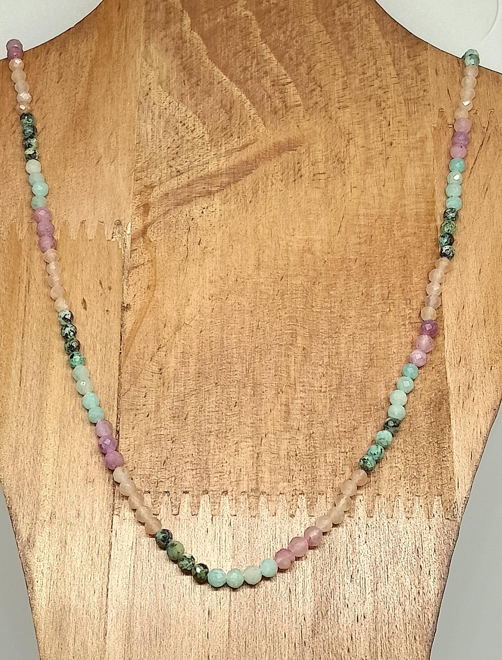 Collier en perles facettes de 2mm d'améthyste, d'aventurine, quartz rose et turquoise africaine. Longueur totale 48cm.