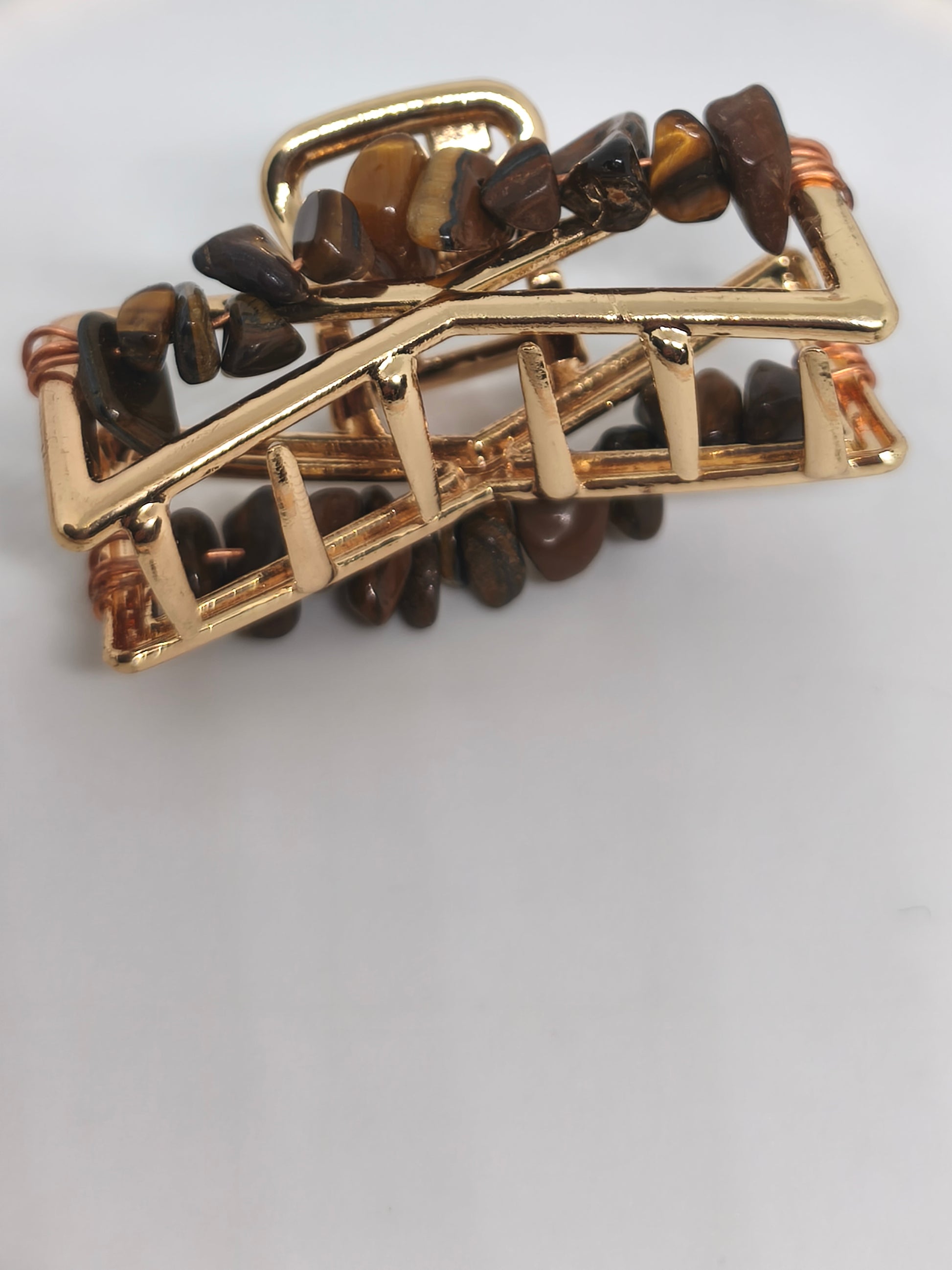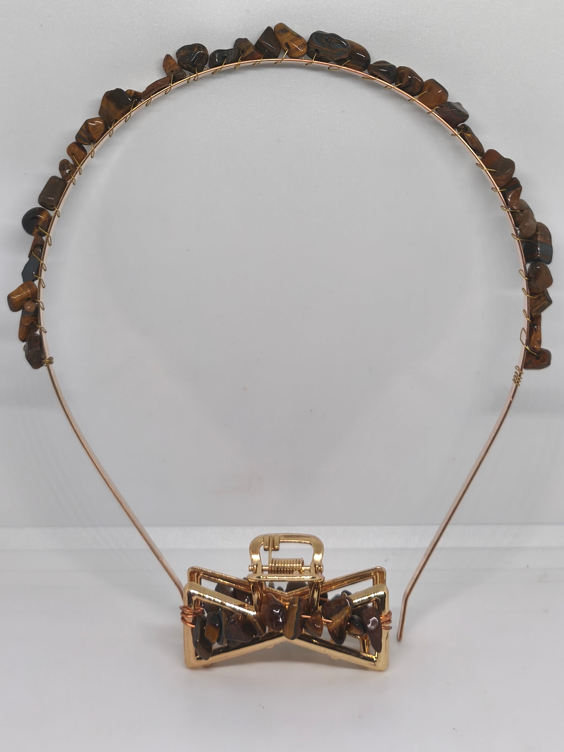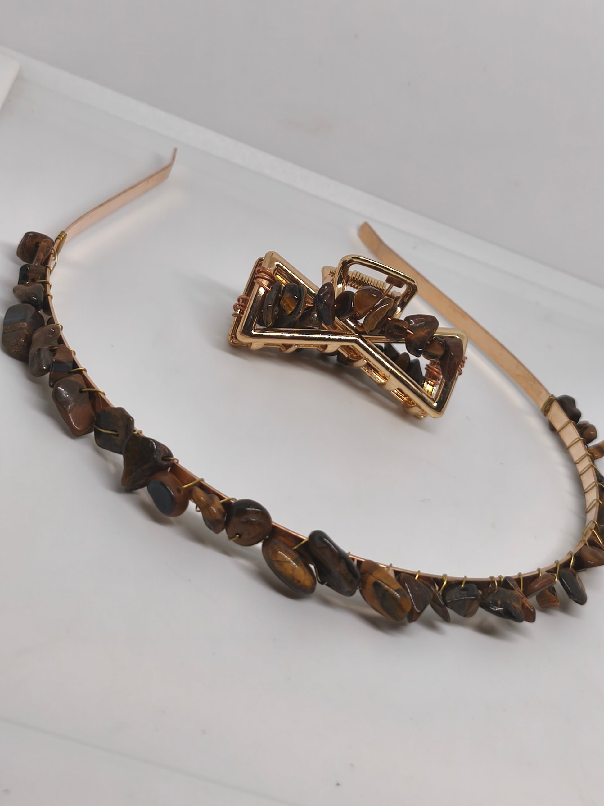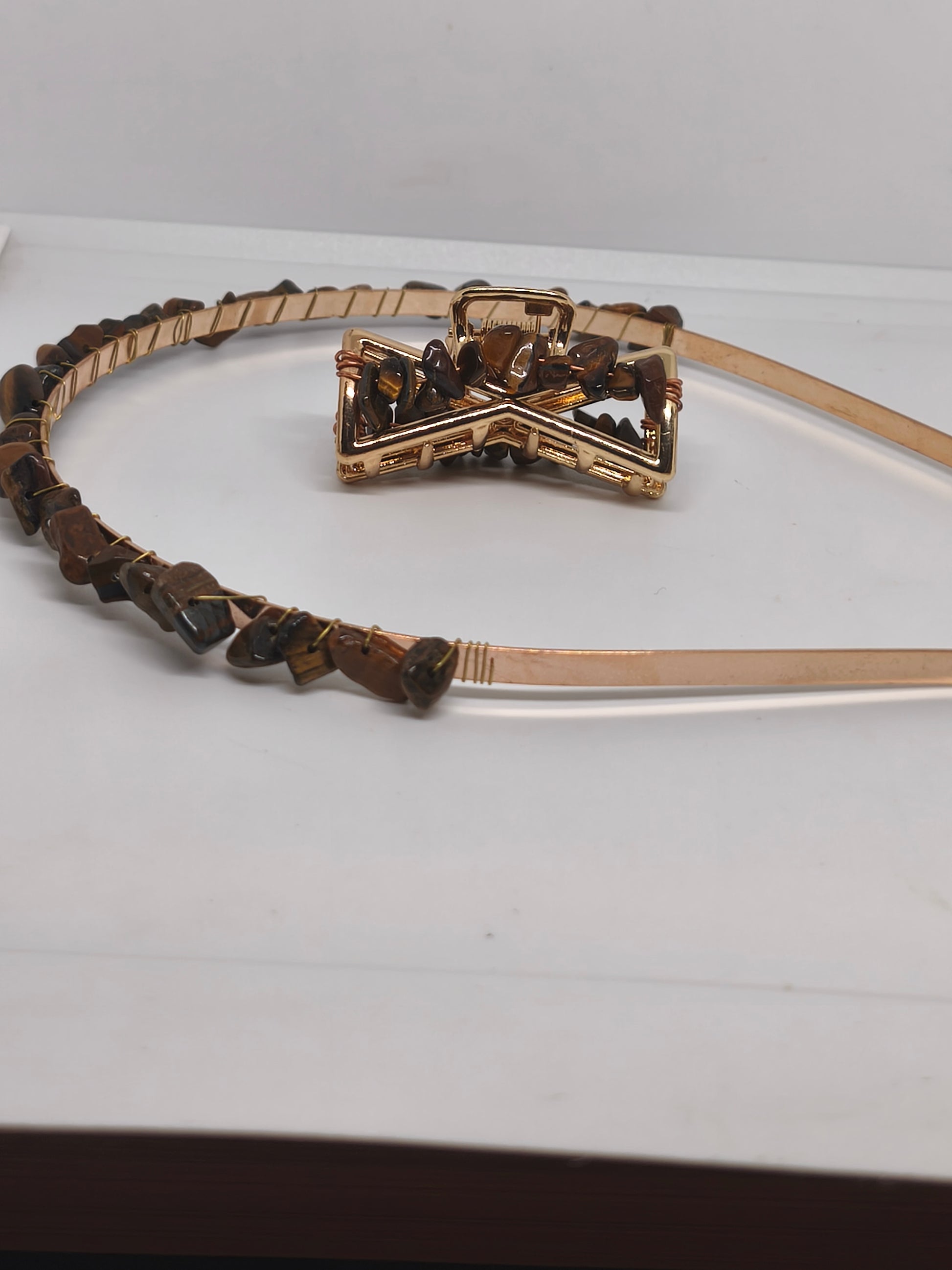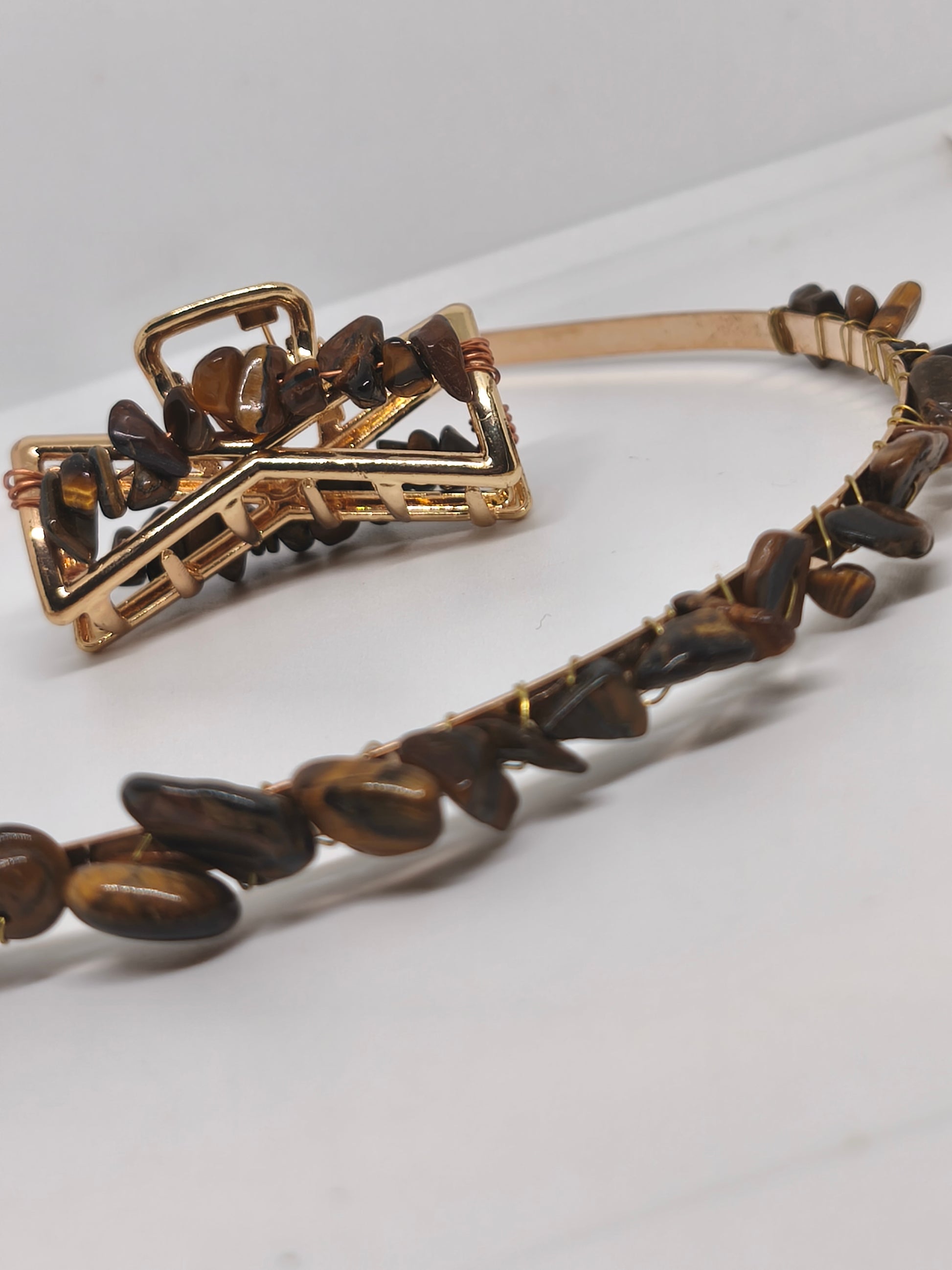 Diadème et pince en acier et chips de pierre d'oeil de tigre