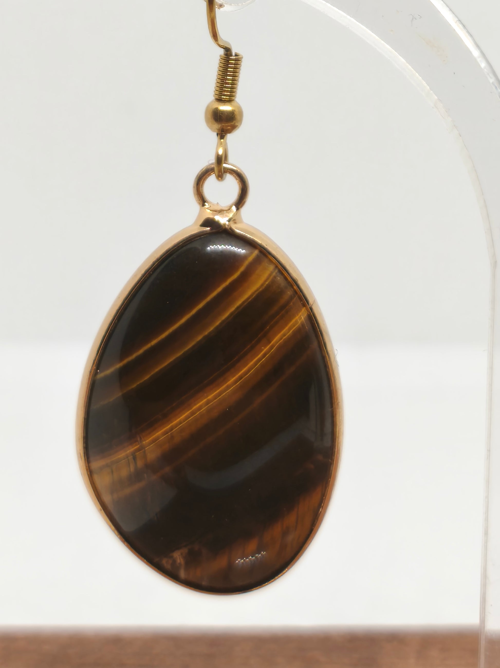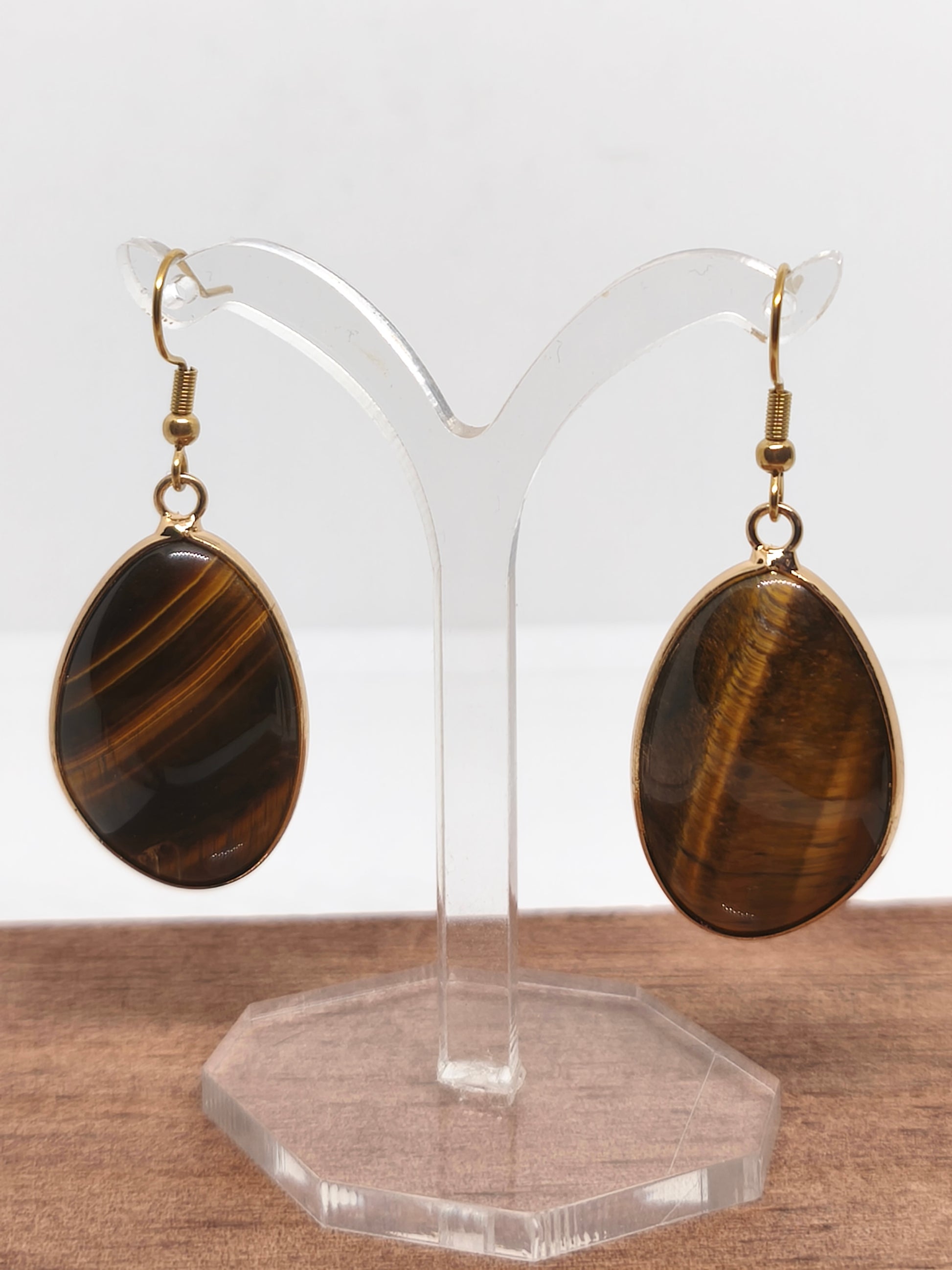 Boucles d'oreilles en œil de tigre. Longueur 5cm, largeur 2,1cm. Poids 15g les deux.