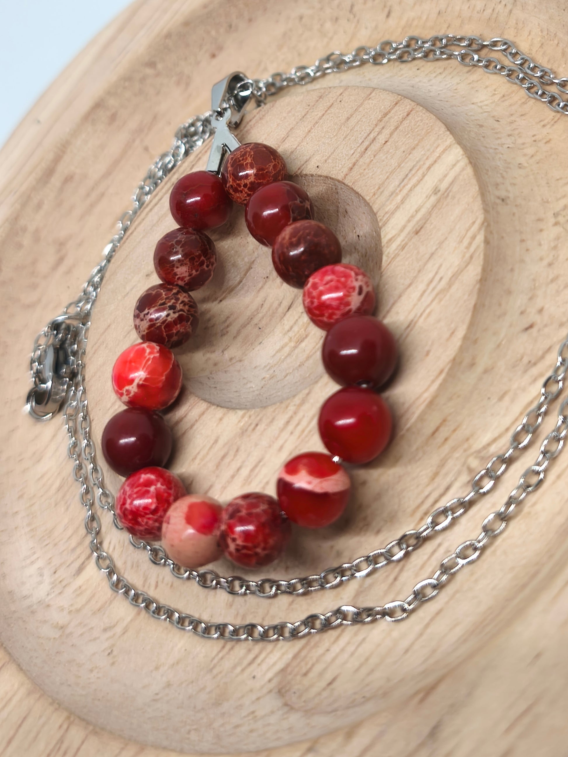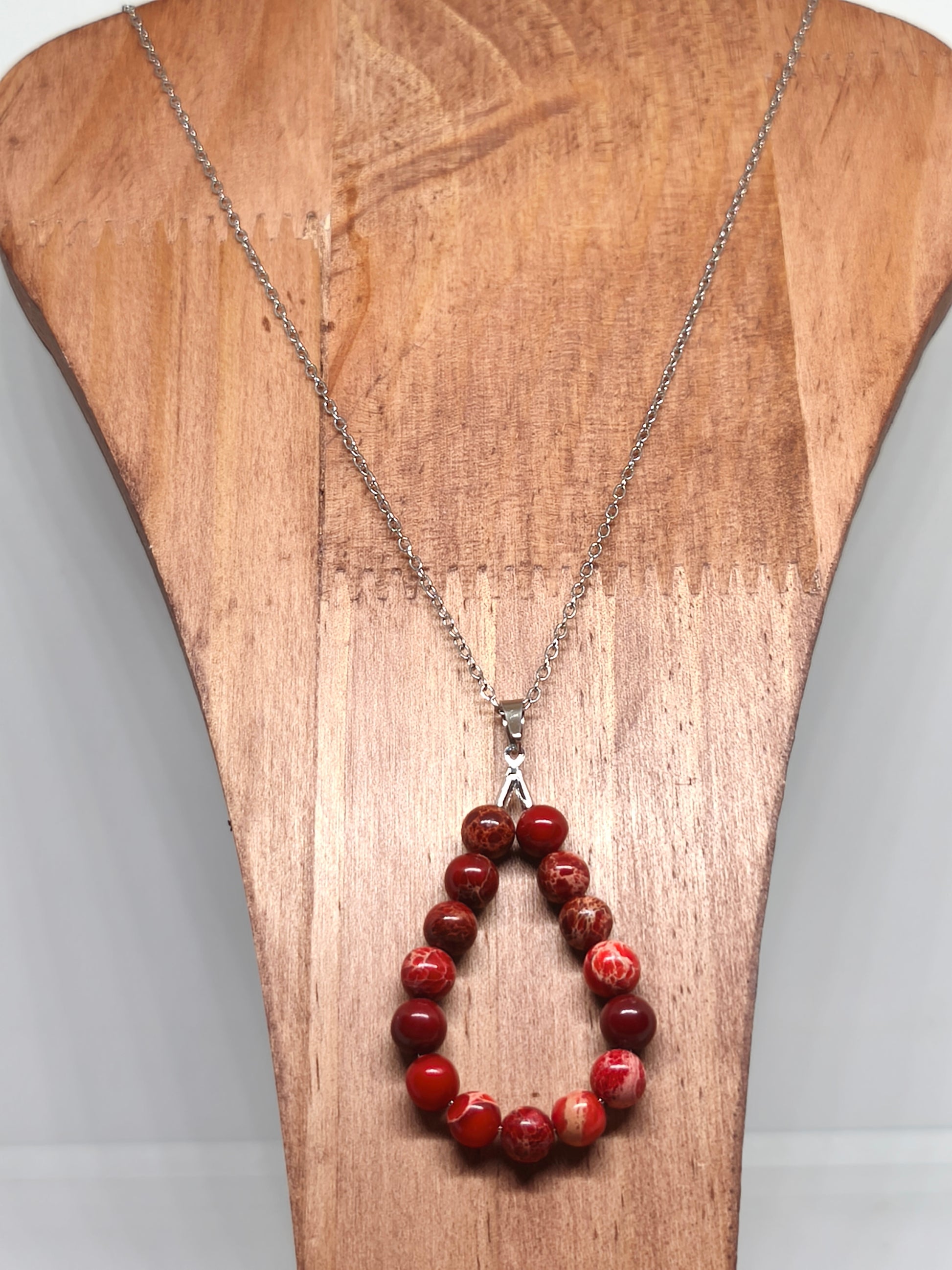 Collier en perles de 6mm de jaspe impérial rouge et chaîne de 50cm en acier inoxydable. Longueur du pendentif avec la bélière 5cm, largeur au plus large 3cm