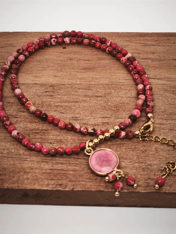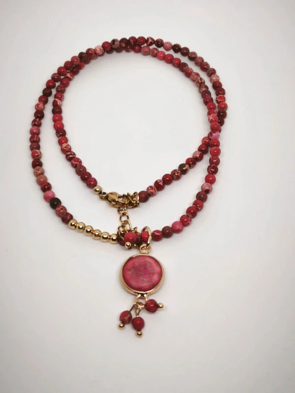 Collier en perles de 4mm de jaspe impérial rouge avec pendentif de 1,3cm de diamètre. Qualité A. Longueur totale 48cm