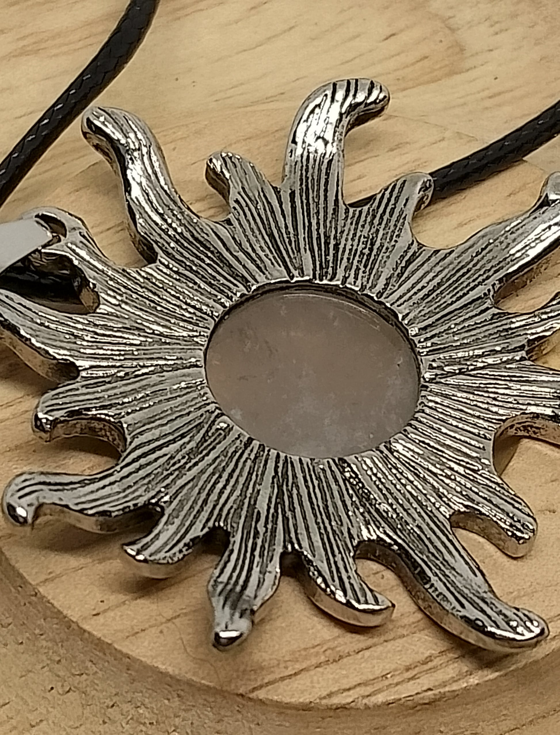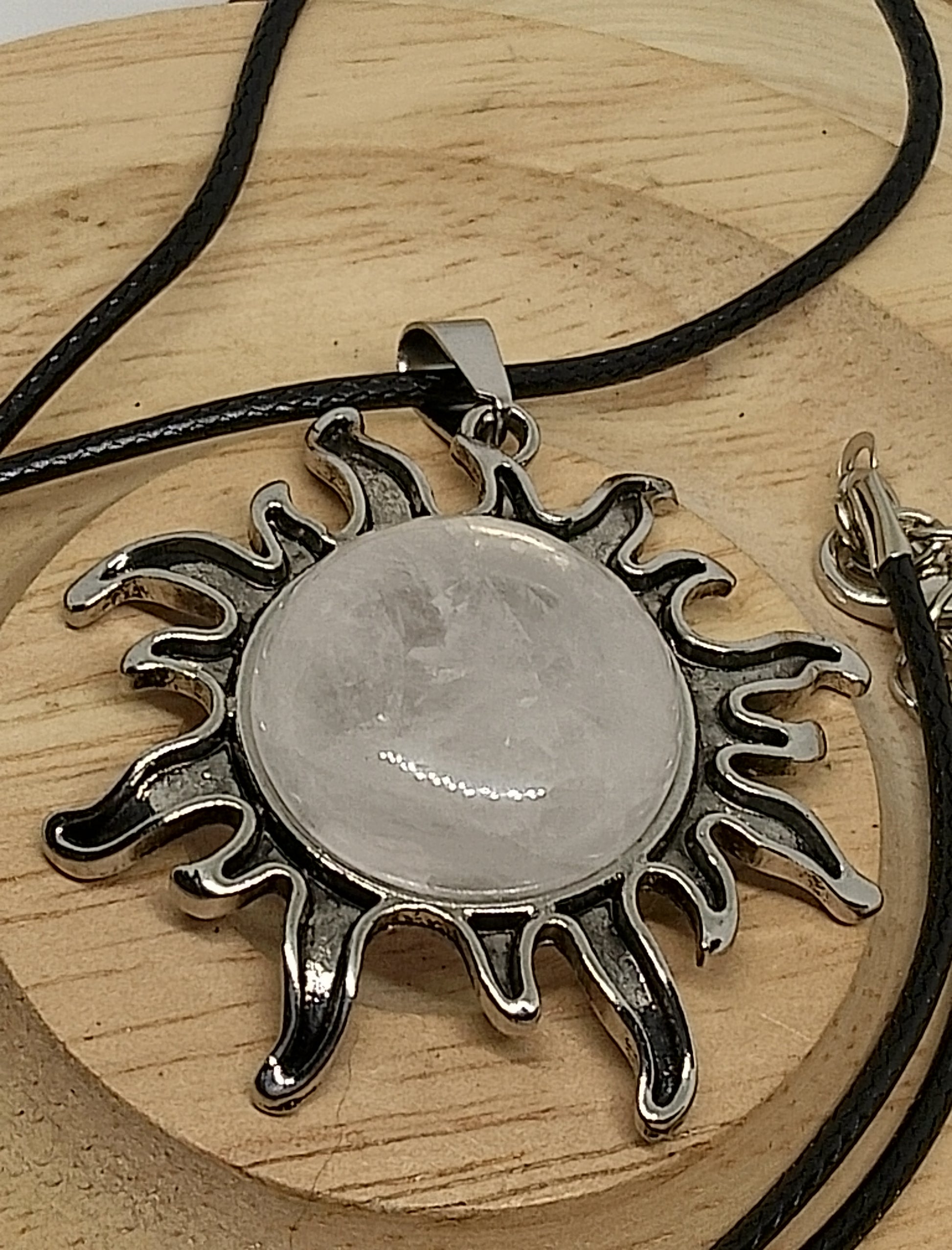 Collier soleil en quartz blanc. Longueur 50cm, pendentif 4cm de diamètre.