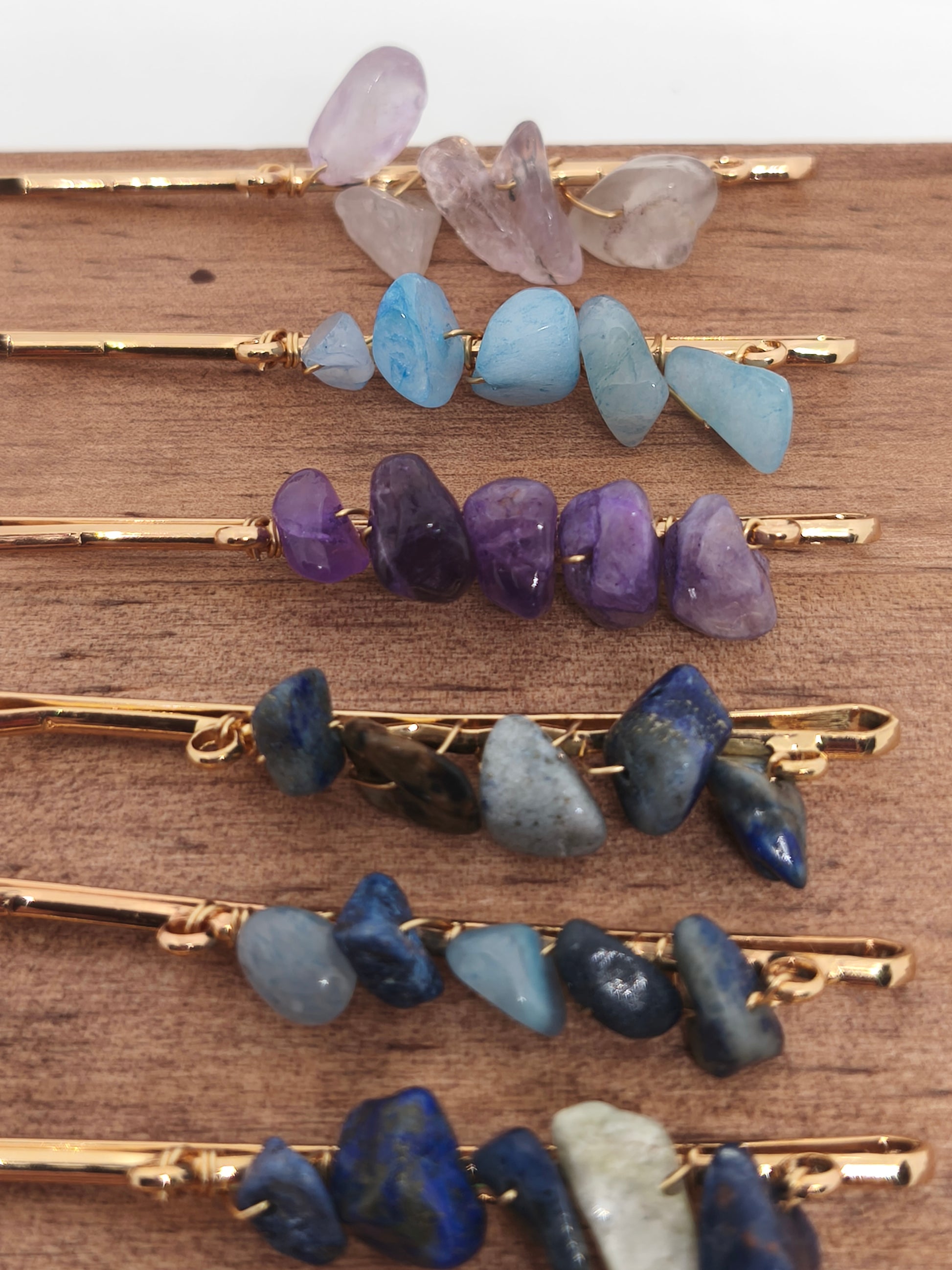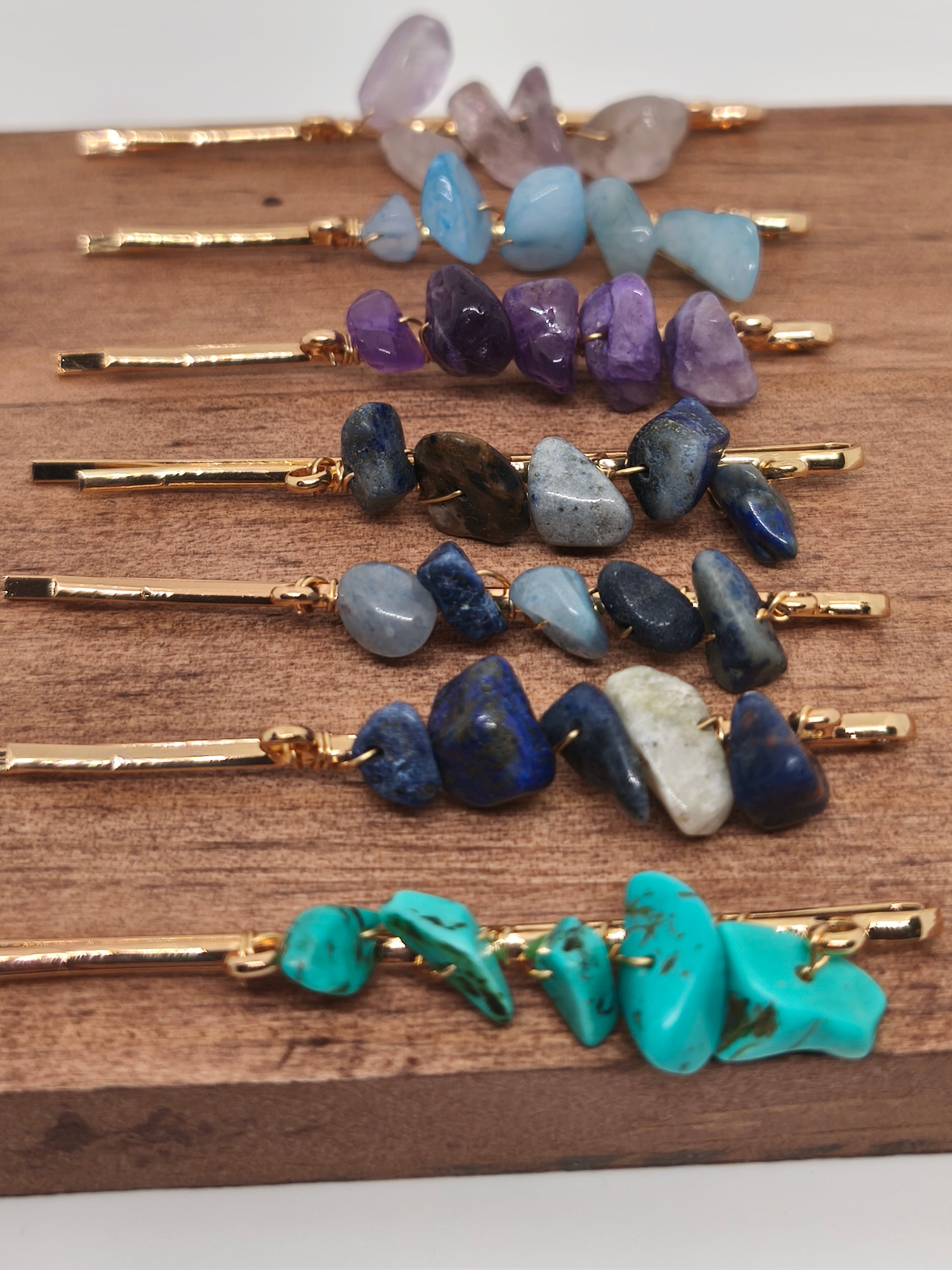 7 barrettes en acier inoxydable et chips de pierres naturelles de turquoise, aigues marines, améthyste et lapis lazuli Longueur 6cm