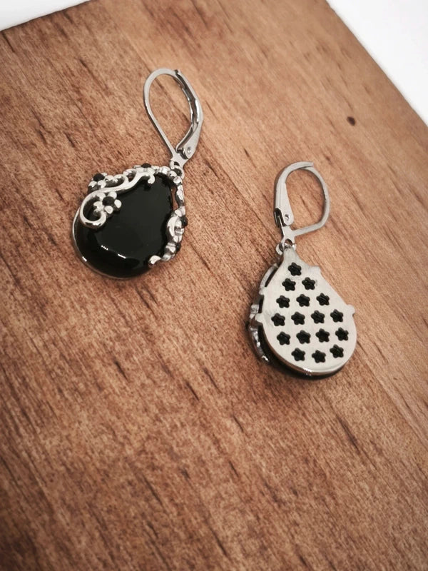 Boucles d'oreilles en pierre d'obsidienne et acier inoxydable. Longueur 3,5cm sur 1,3cm Poids 10g les deux.