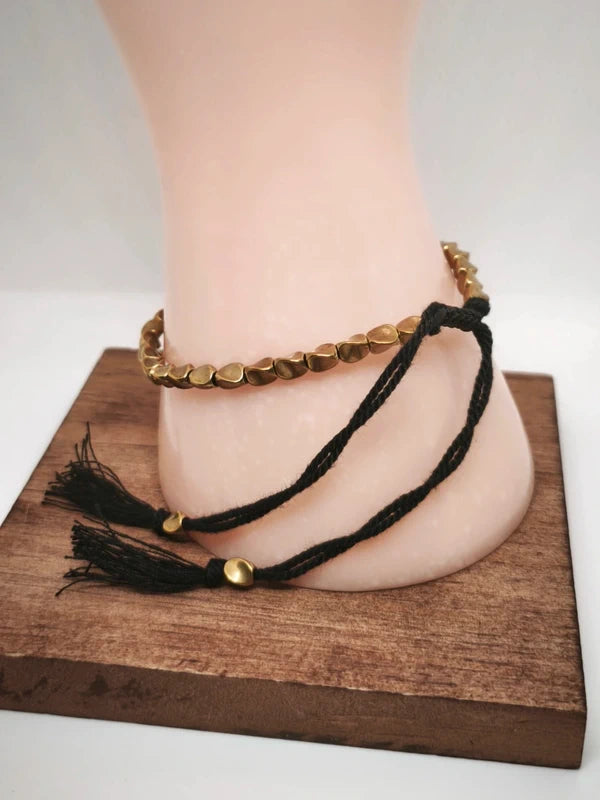 Bracelet tibétain ajustable en cuivre doré. Perles de cuivre 4mm. cordon rouge ou noir selon disponibilité