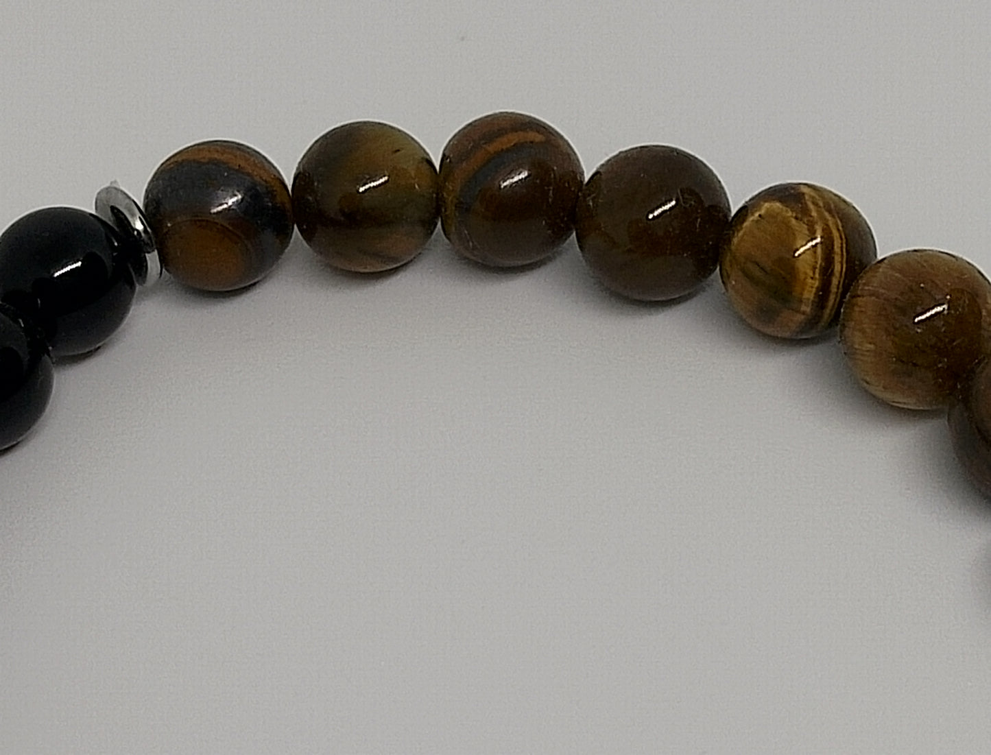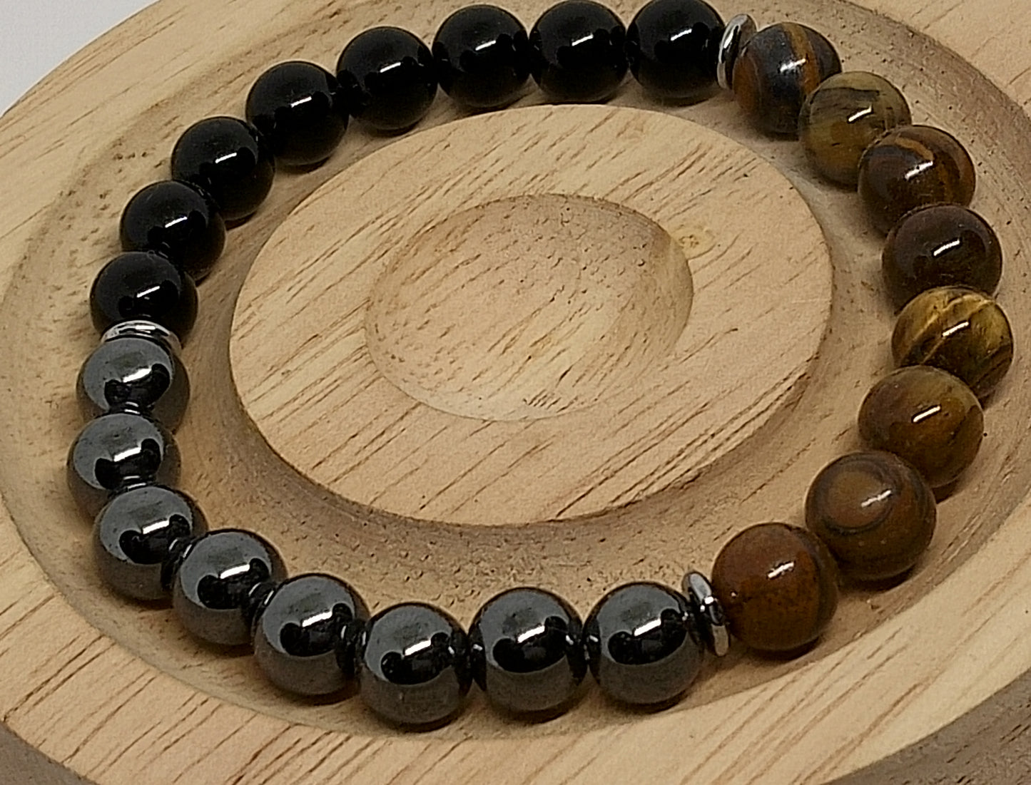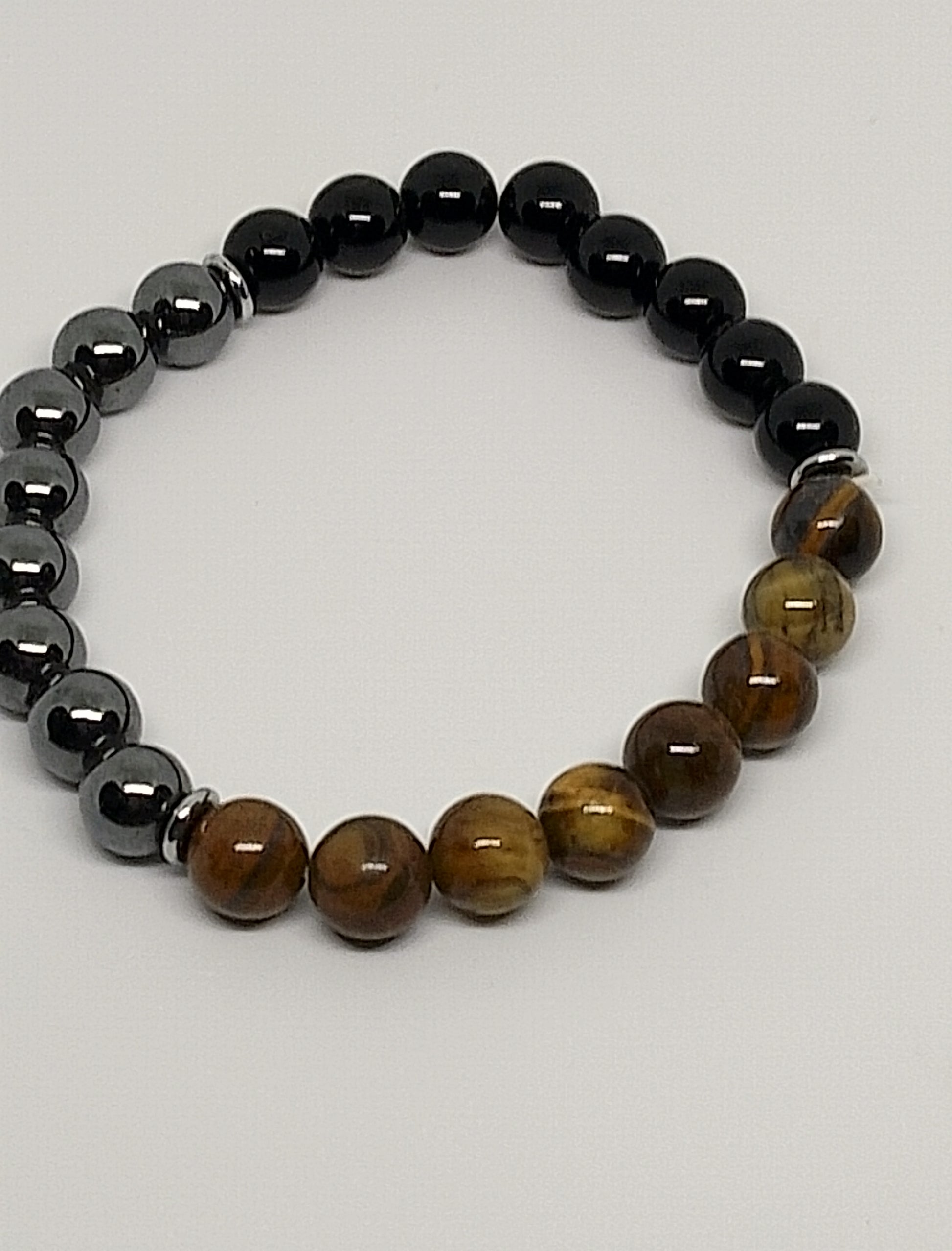 Bracelet triple protection en perles de 8mm d'onyx noire, d'oeil de tigre et d'hématite. Poignet 16-17cm