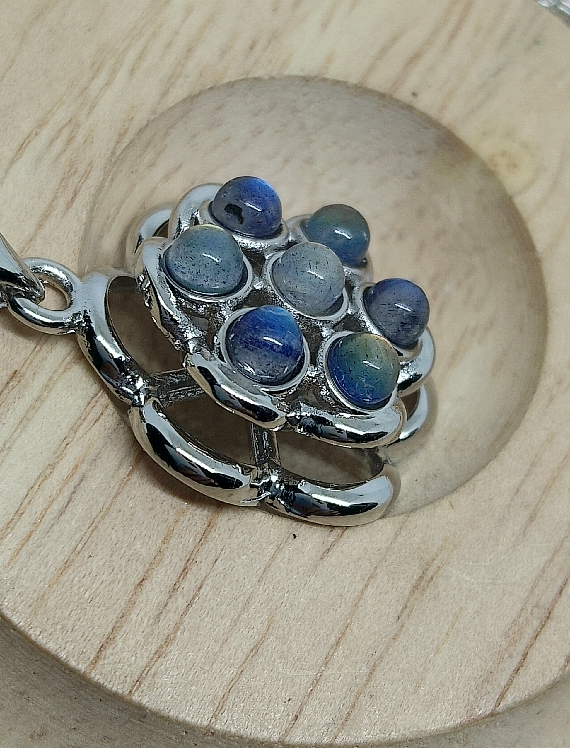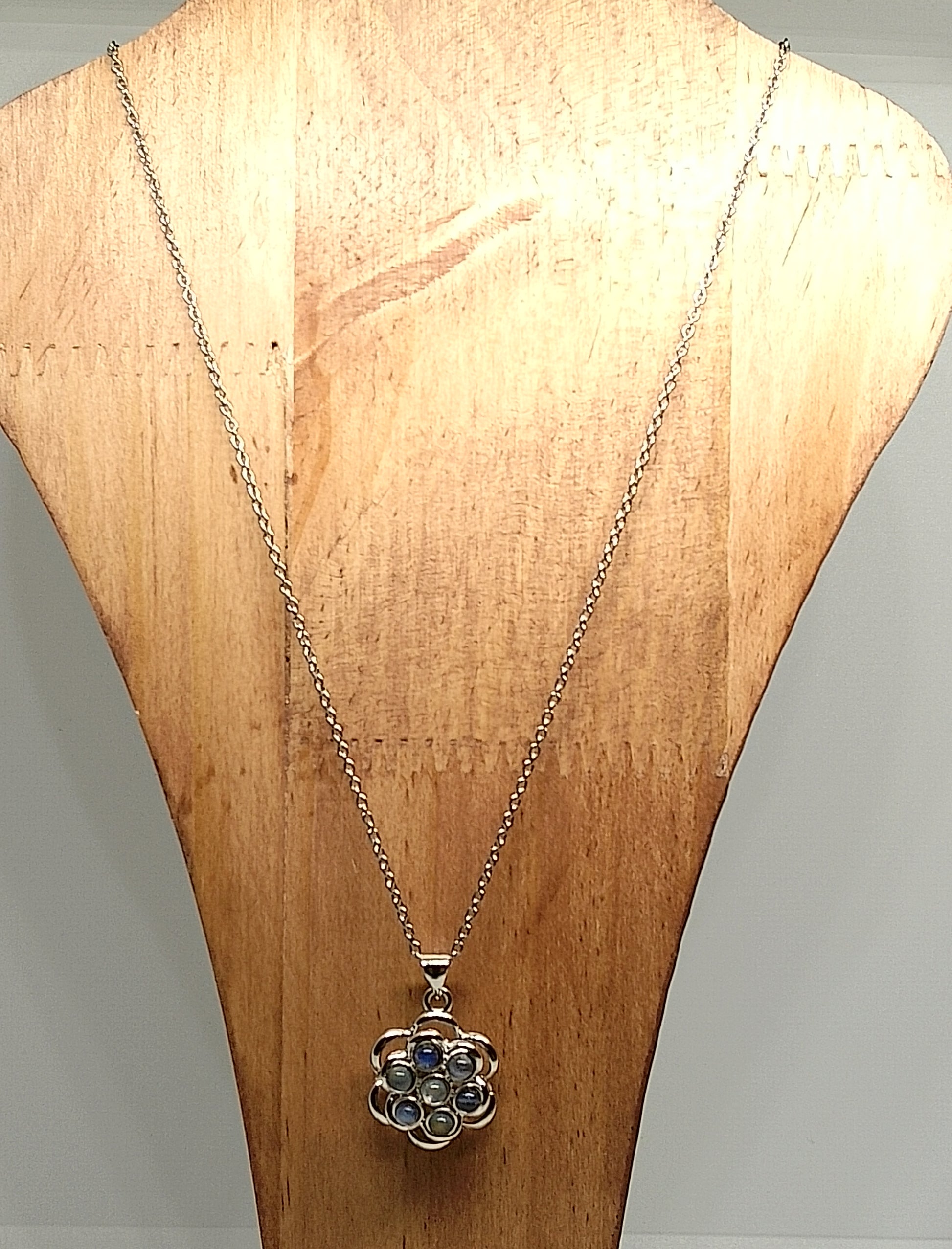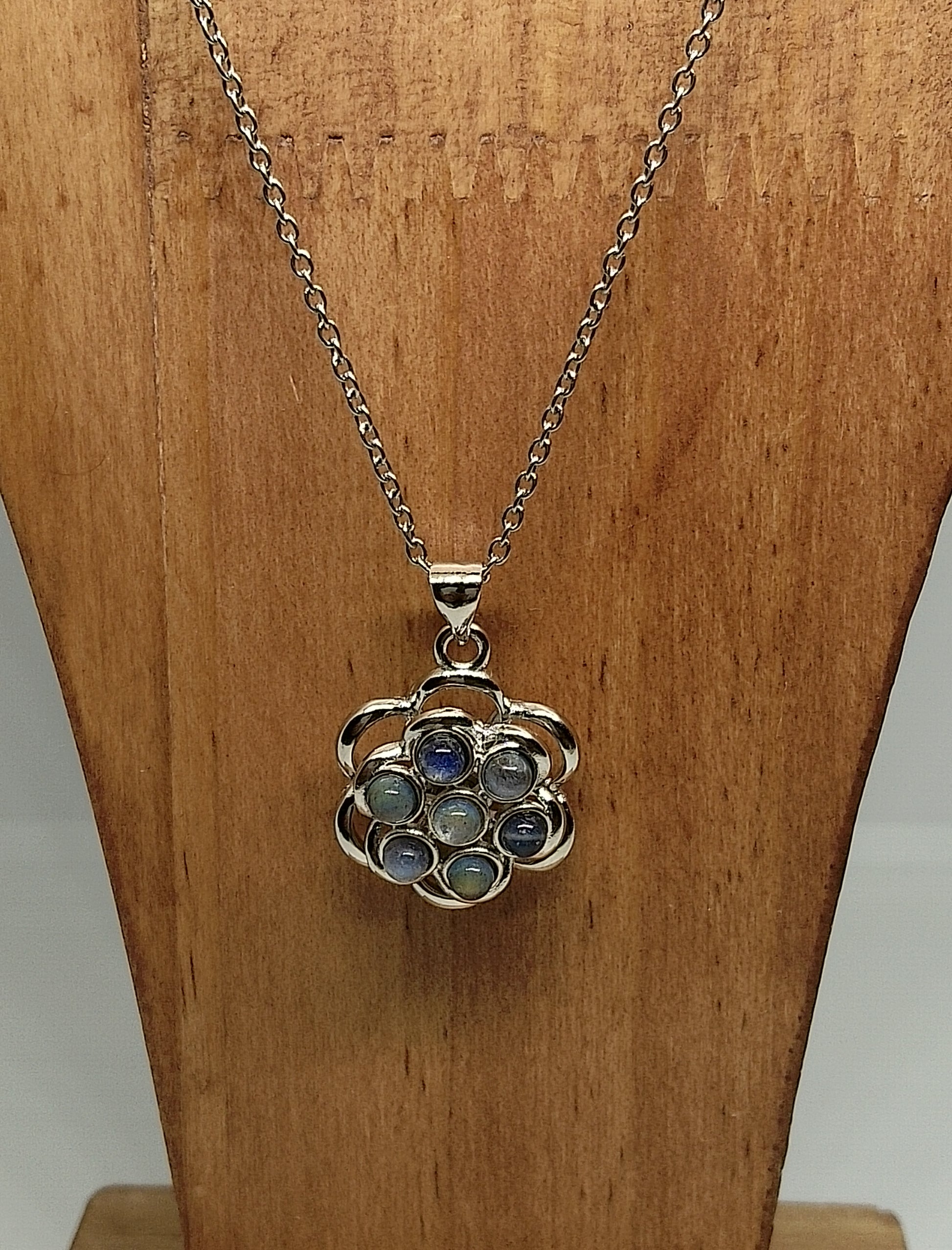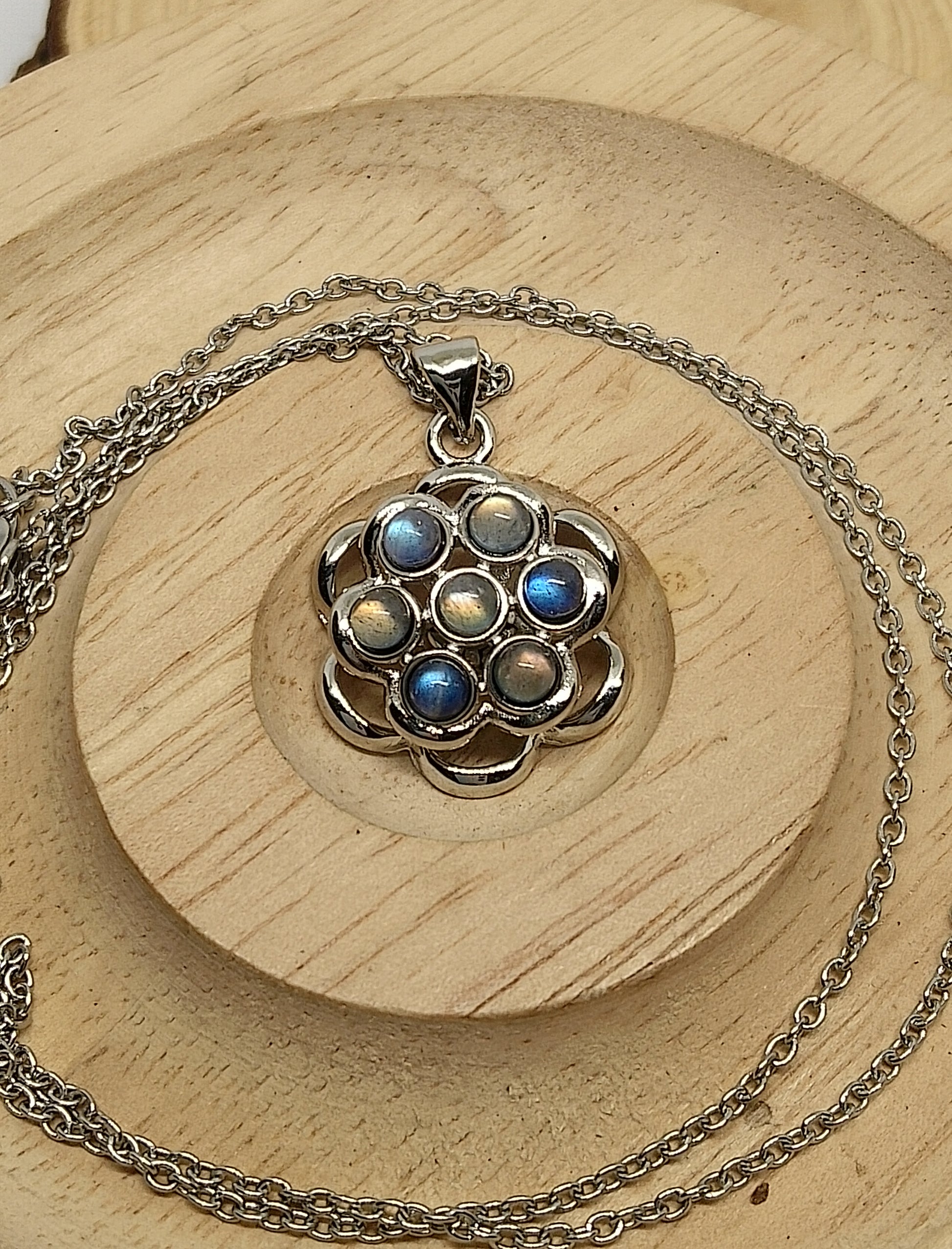 Collier en acier inoxydable avec chaîne de 50cm, pendentif amovible avec perles de labradorite certies de 2cm de diamètre.