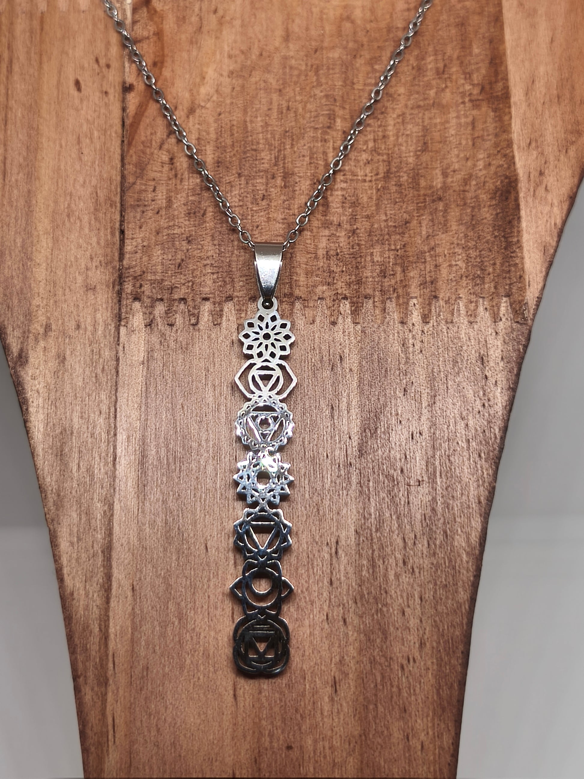 Collier en acier inoxydable motifs 7 chakras. Longueur 31cm, pendentif avec la bélière 6,5cm.