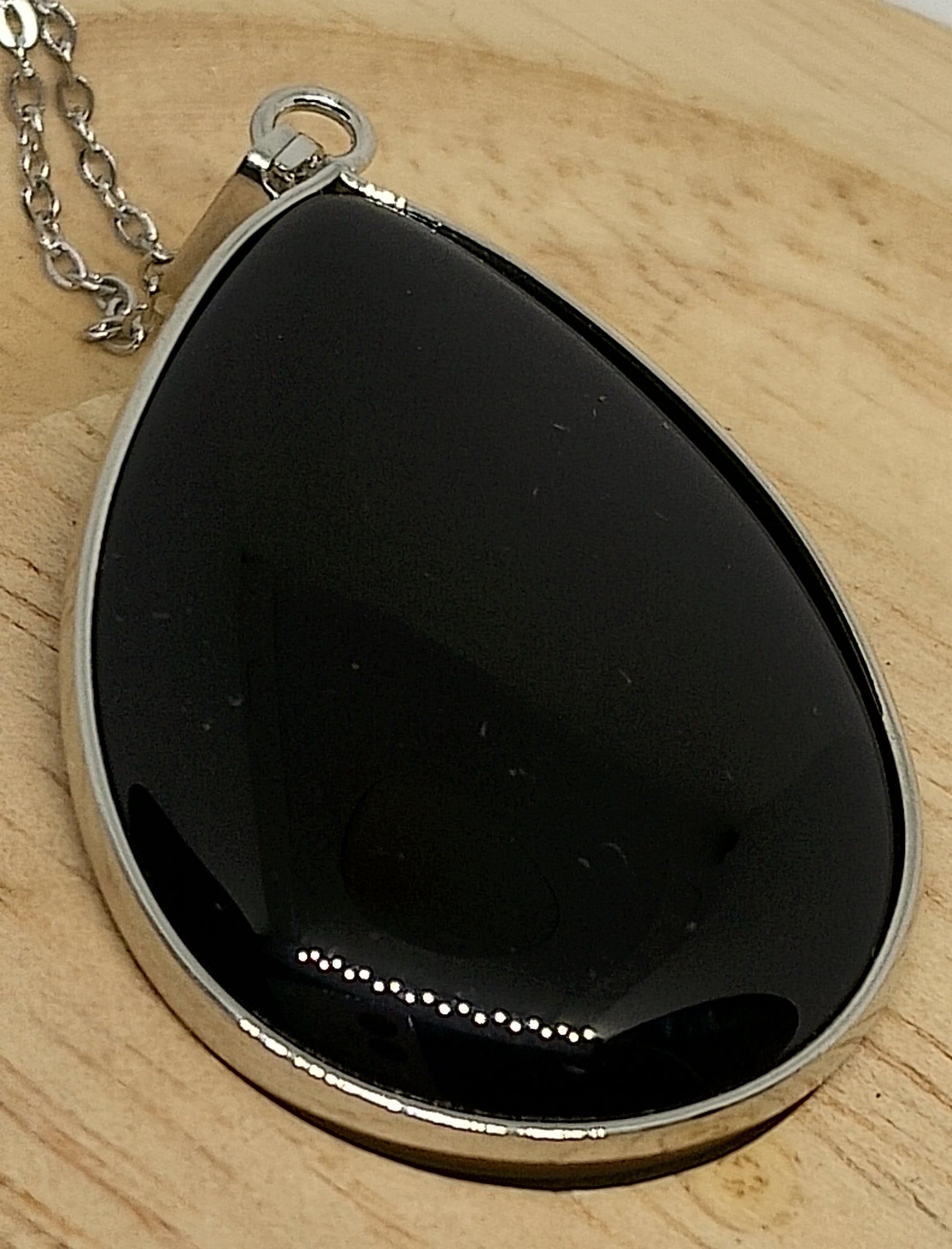 Collier en agate noire et acier inoxydable. Longueur totale de la chaîne 50cm, pendentif 4cm sur 2,5cm.