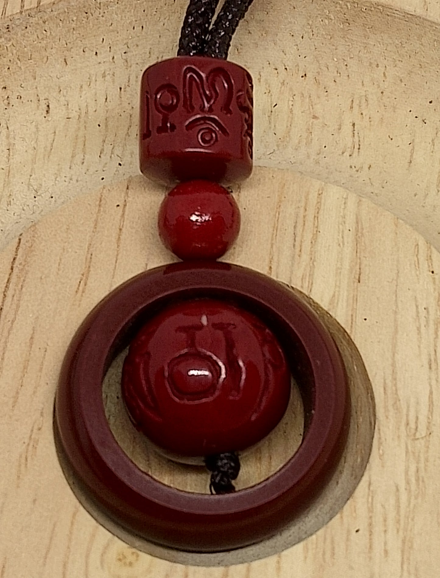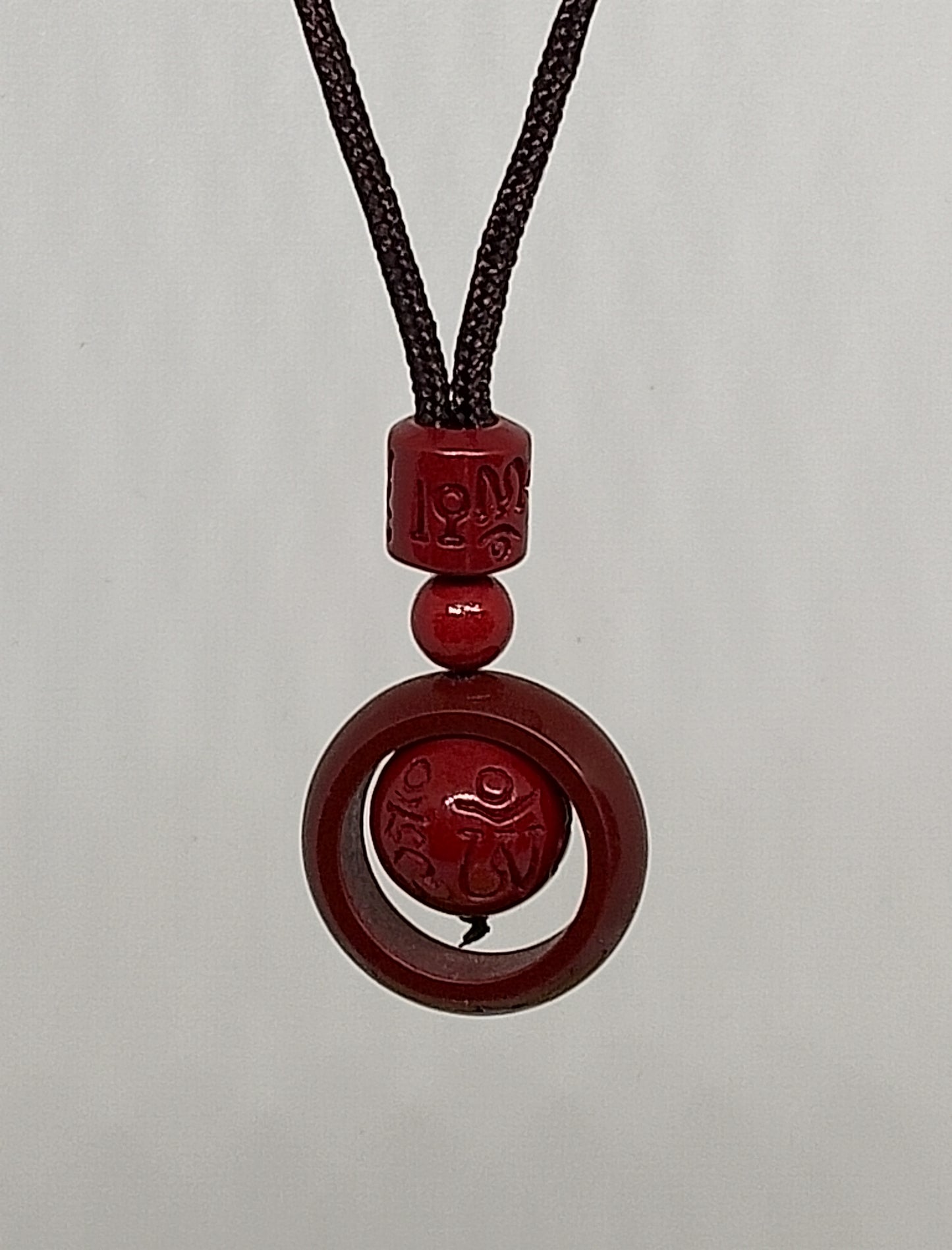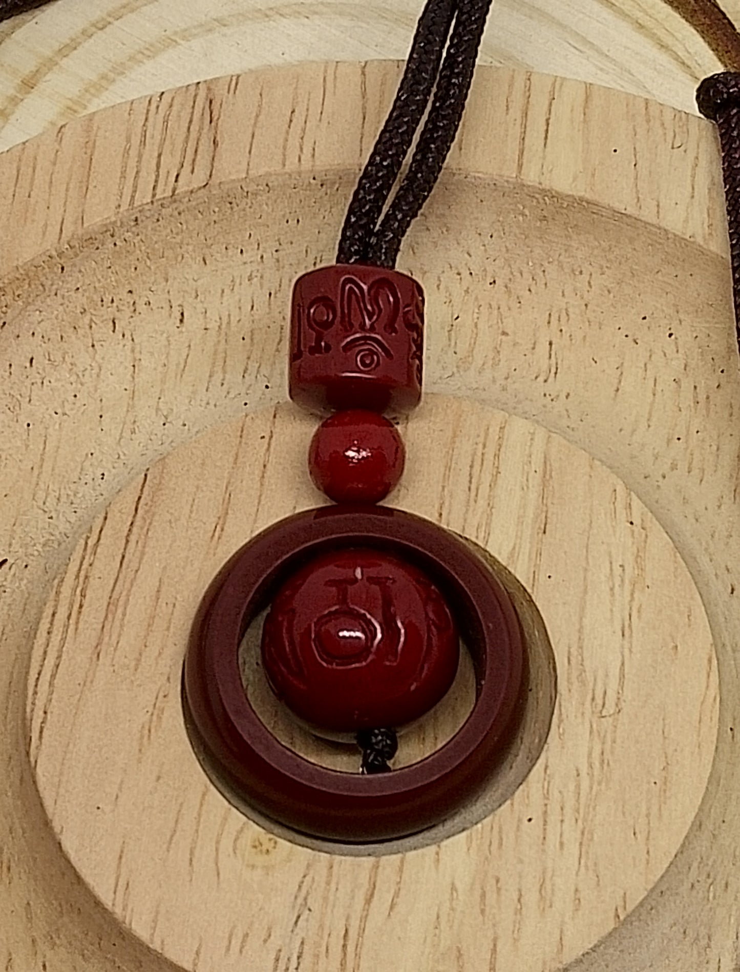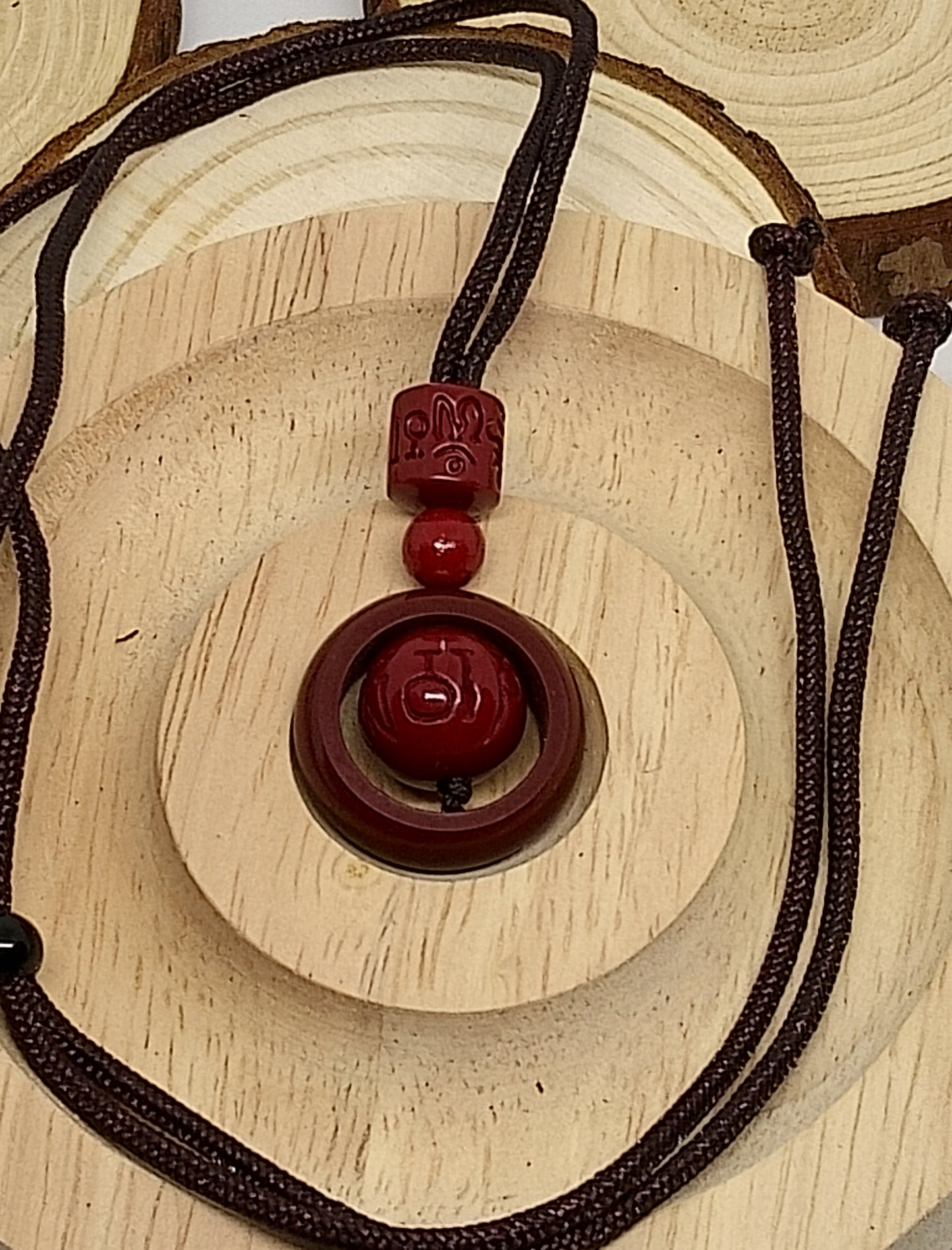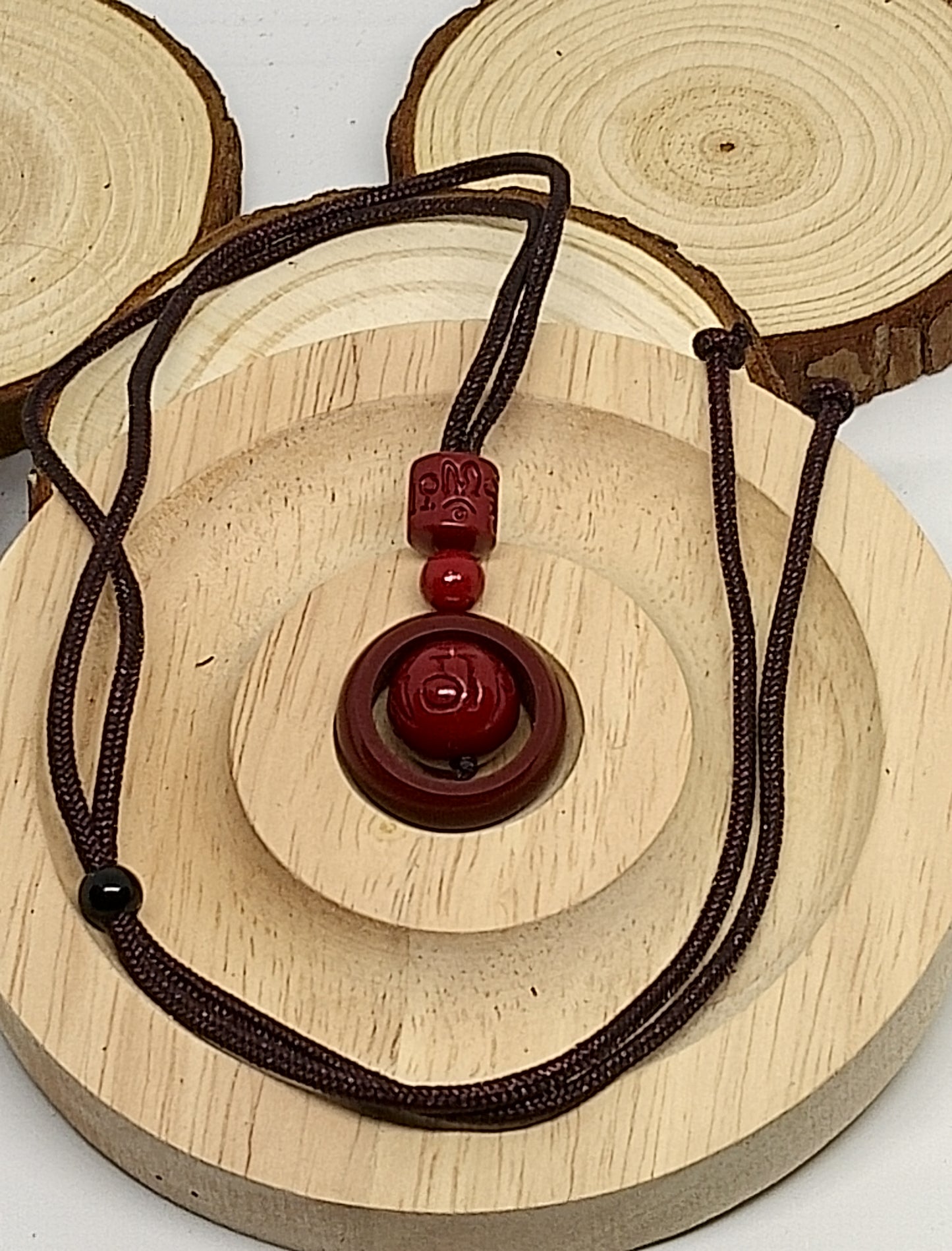 Collier en bois ethnique et perle de cinabre avec cordon ajustable jusqu'à 27cm Pendentif 4cm sur 2cm