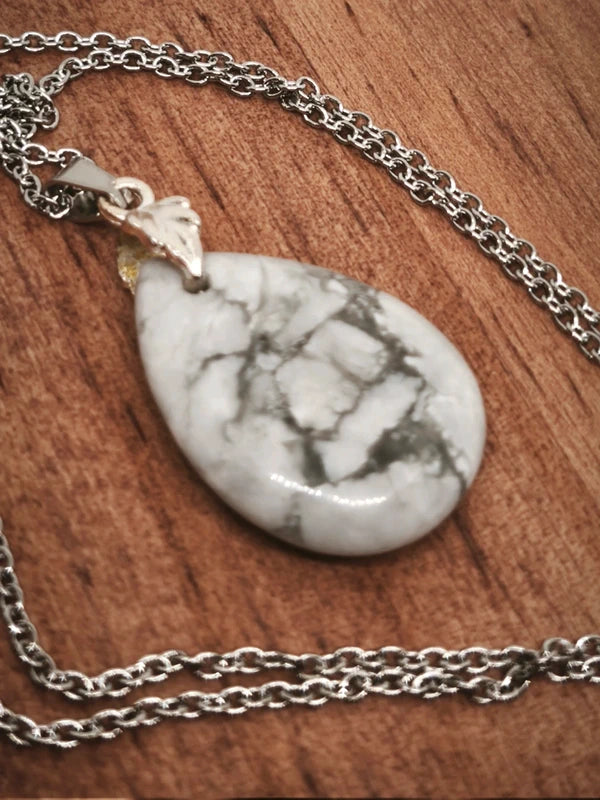 Collier en pierre d'howlite blanche et chaîne de 50cm en acier inoxydable. Pendentif environ 2,5cm sur 2cm.