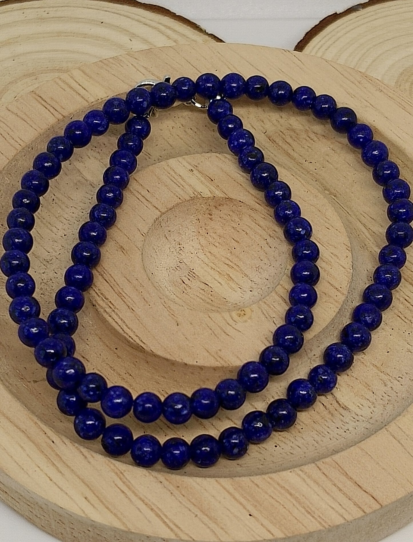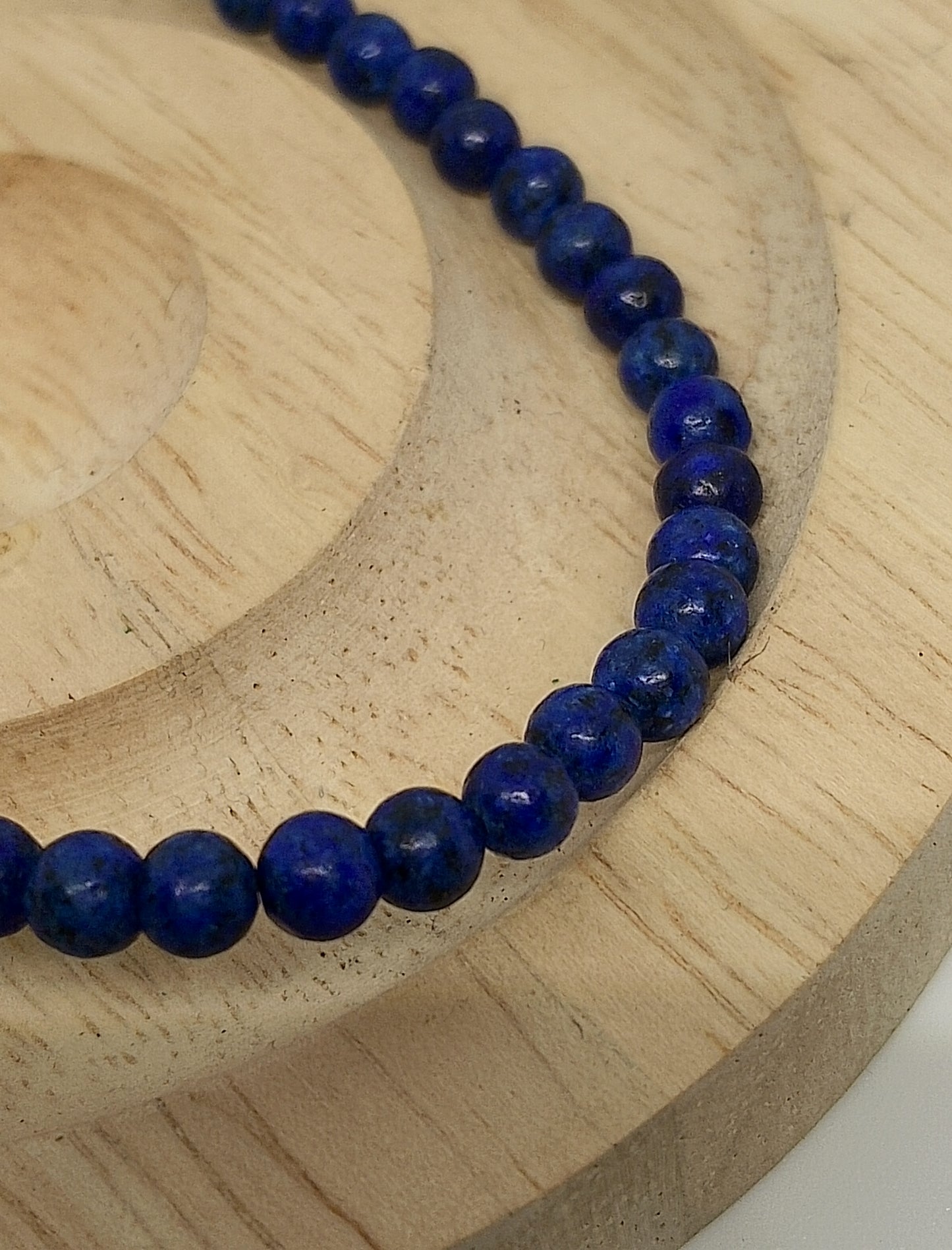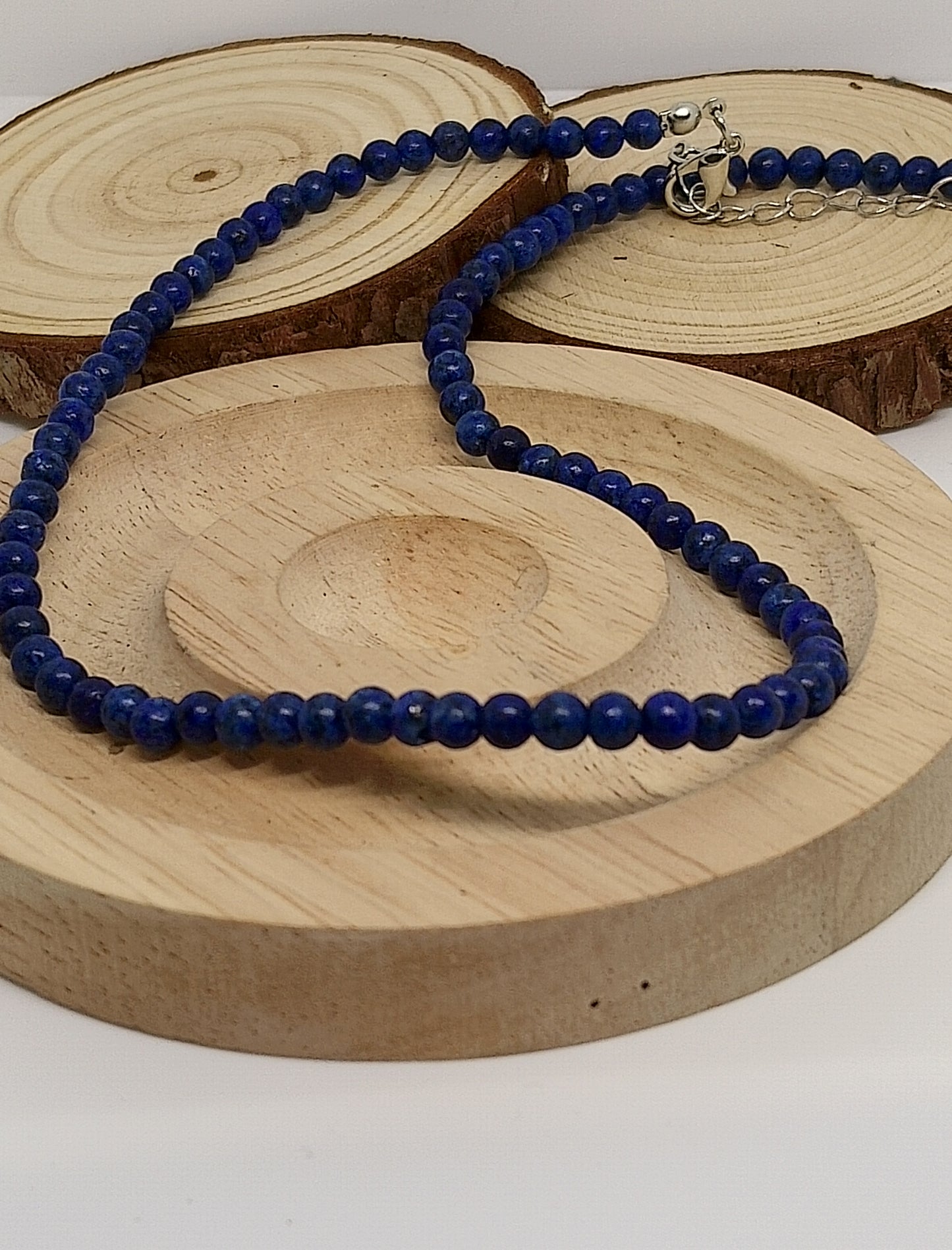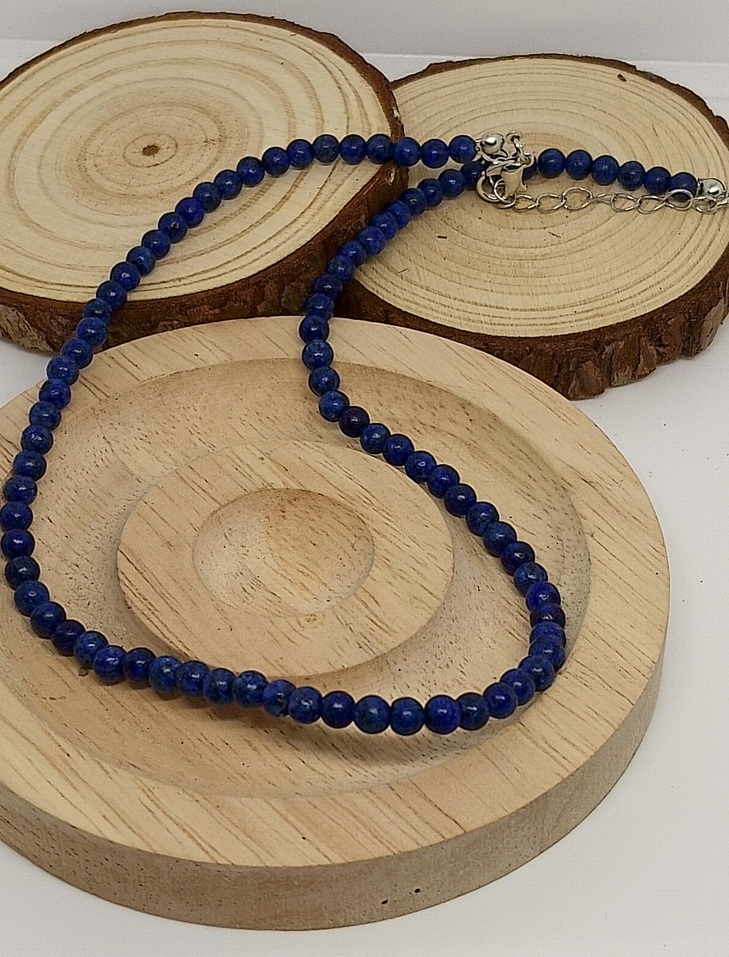 Collier ras de cou en perles de lapis lazuli 4mm. Longueur 29cm porté.