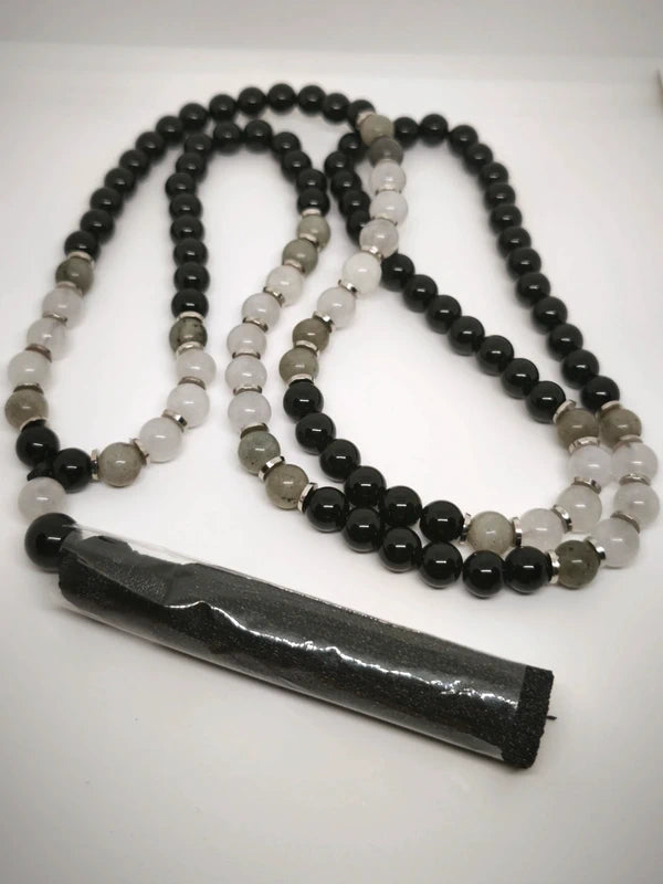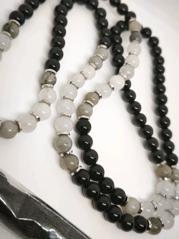 Collier Mala en perles de 8mm d'onyx noire, de quartz laiteux et de labradorite. Longueur porté 54cm.