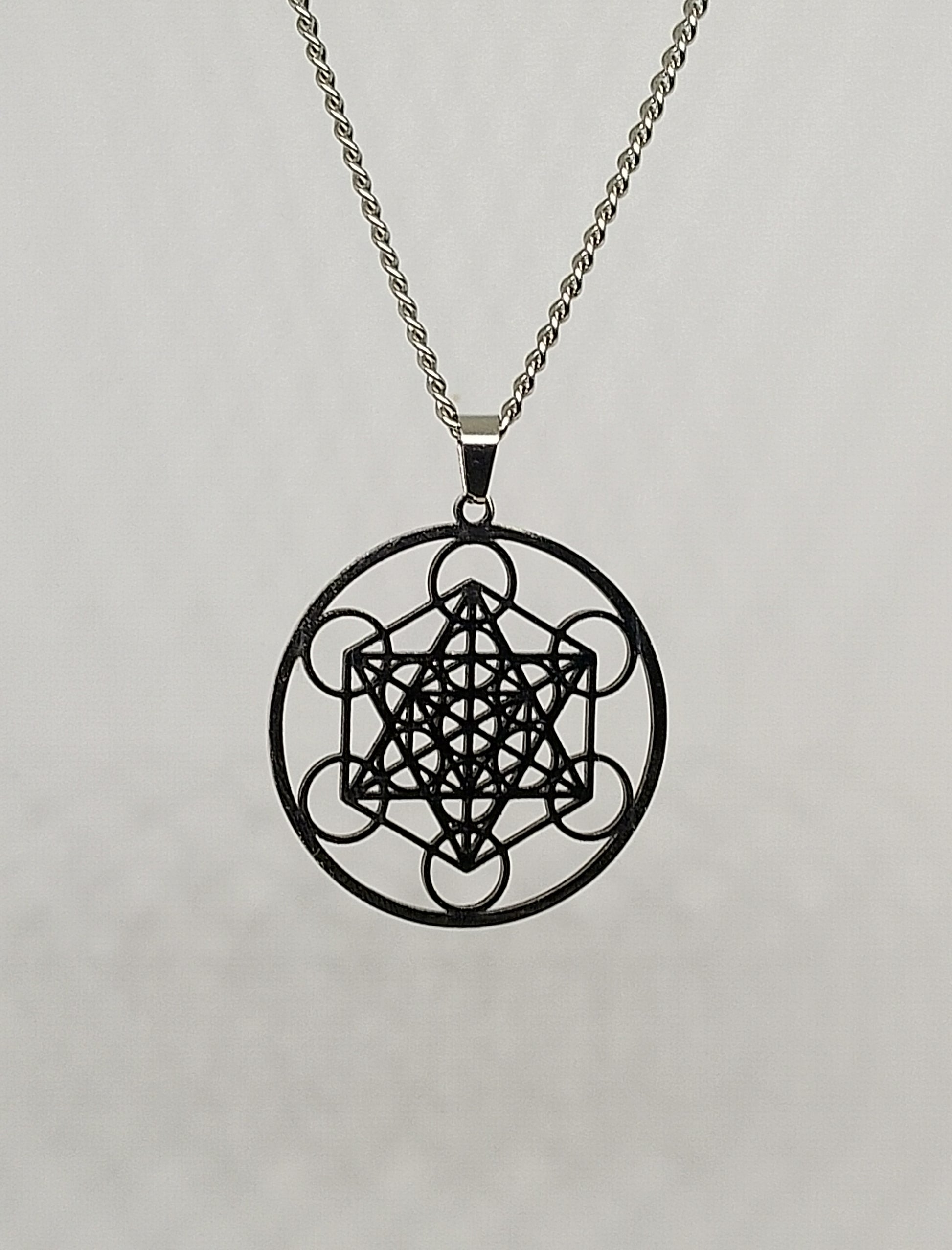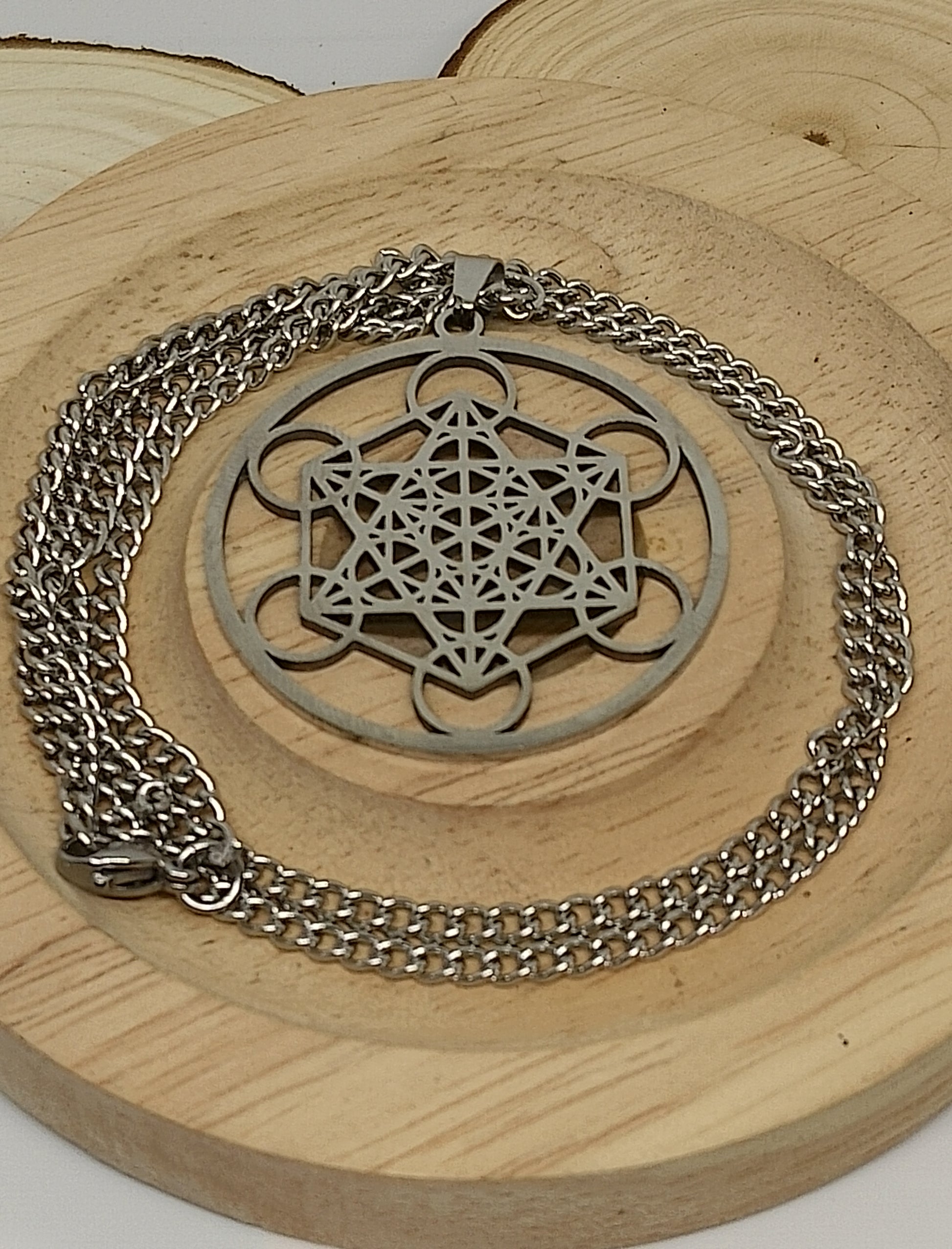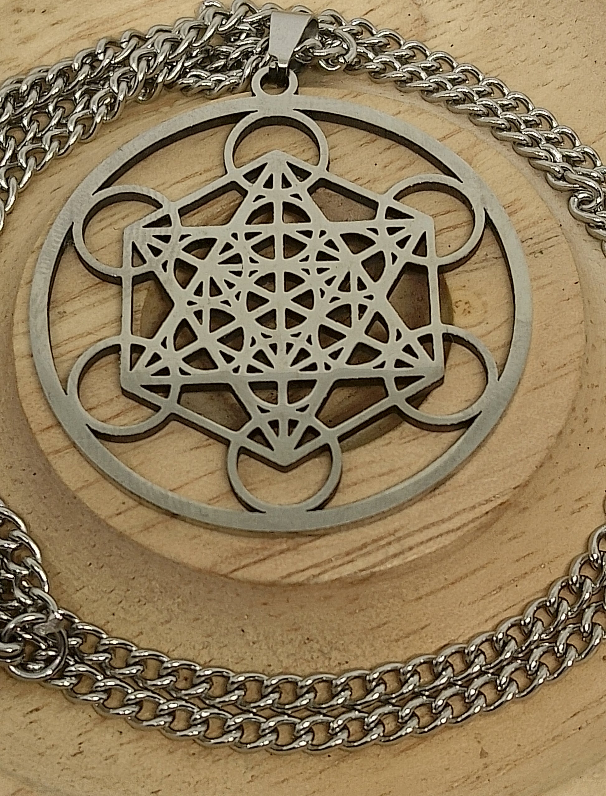 Collier métatron en acier inoxydable. Longueur 34cm, diamètre du pendentif 4cm.