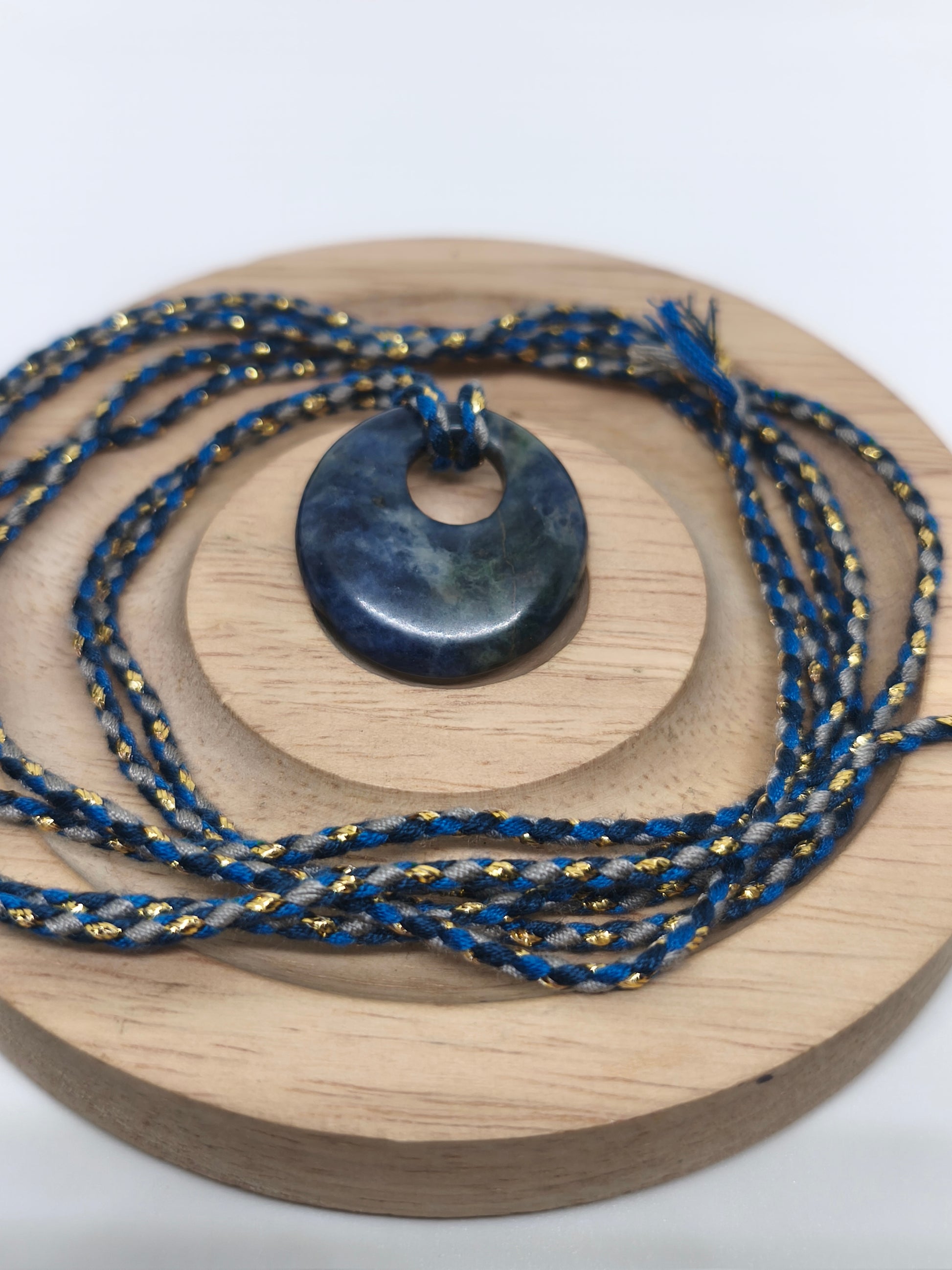 Un collier en pierre polie de 2,5cm de diamètre, longueur du cordon très long. Peut être ajusté à la taille que vous souhaitez.